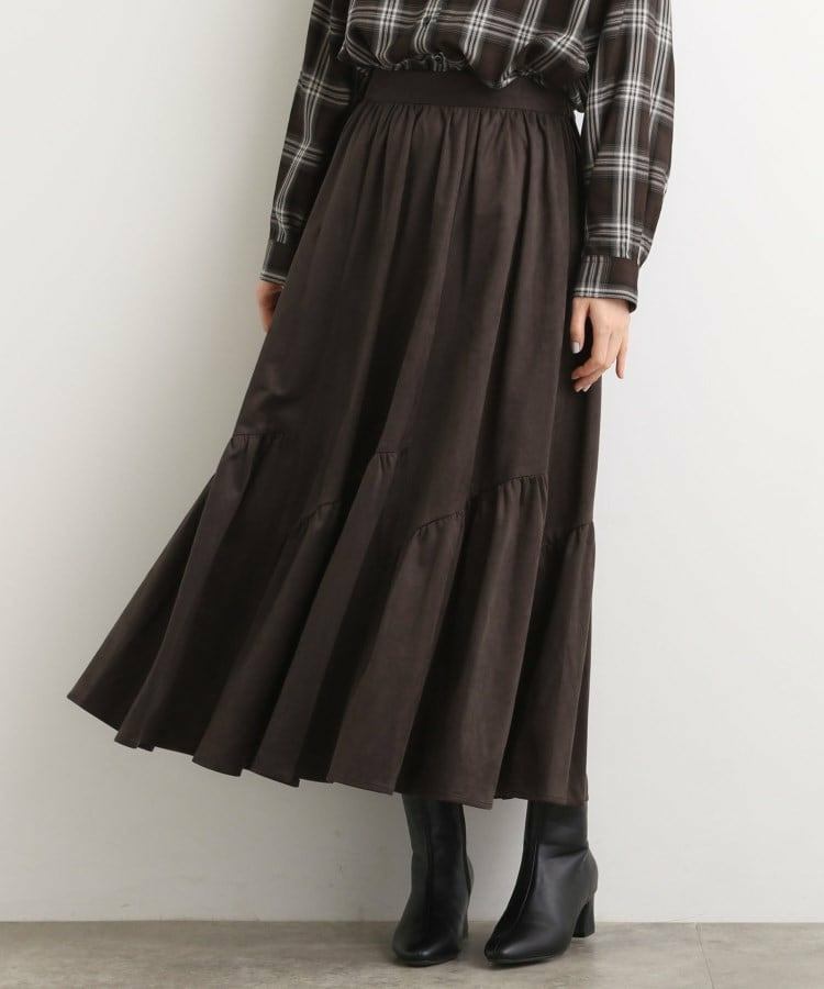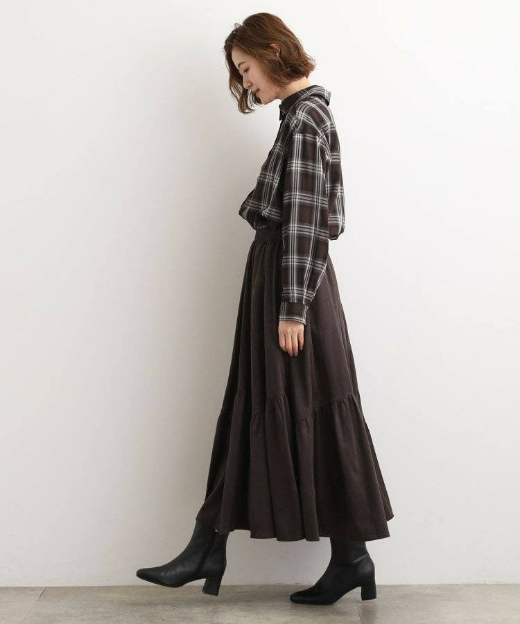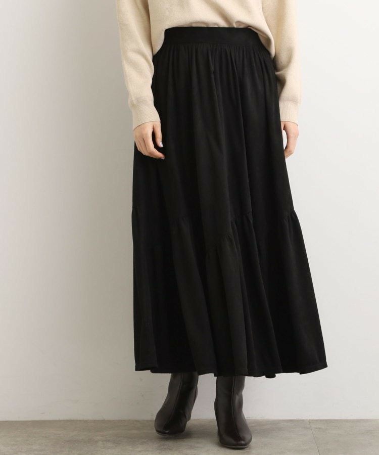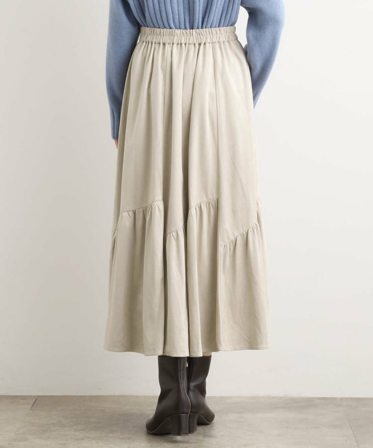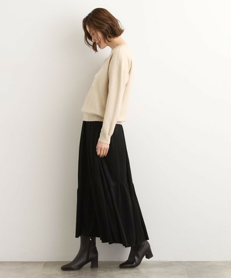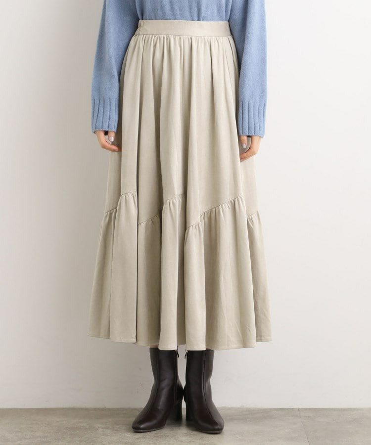 切替を入れることで、エスカルゴラインのように変化をつけたティアードスカート。