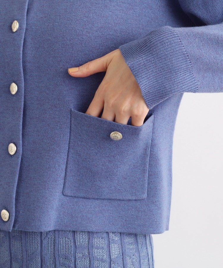 紋章モチーフの金ボタンがクラシカルな華やぎを添え、左右裾にはパッチポケットをあしらい実用性も兼ね備えています。