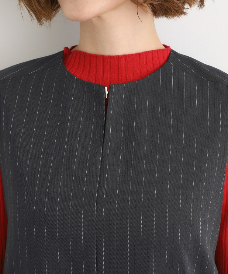 衿ぐりにはホックをあしらい、留めれば上品なクルーネック風に、外せば抜け感のあるキーネックとして着用できる2WAY仕様です。