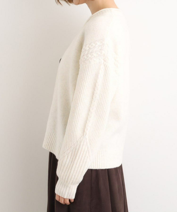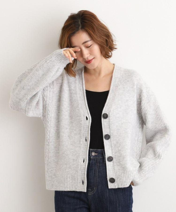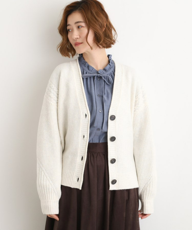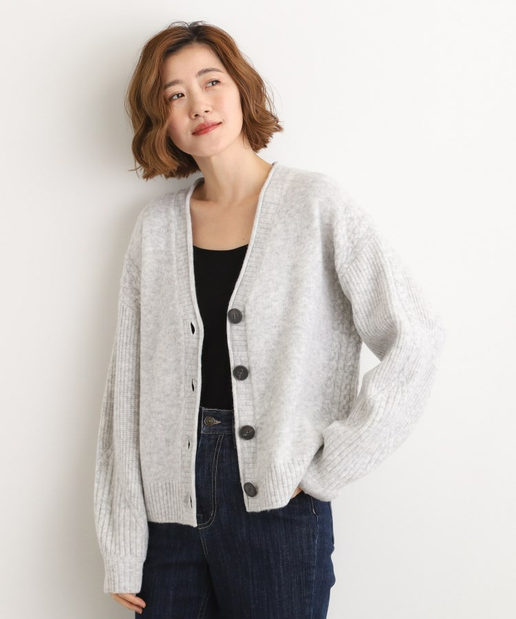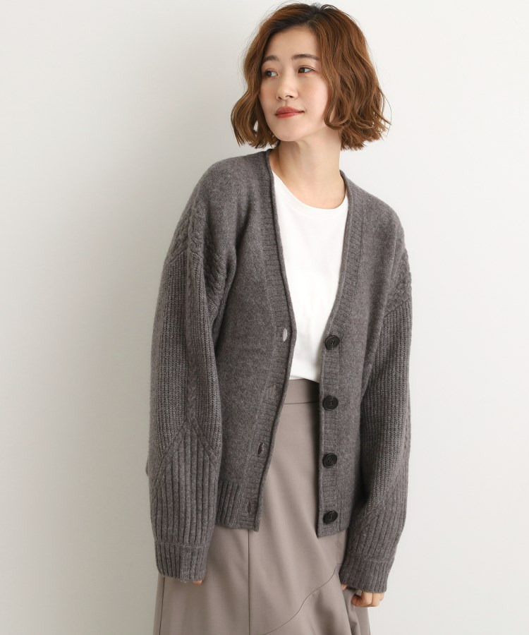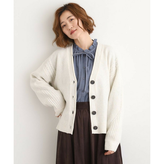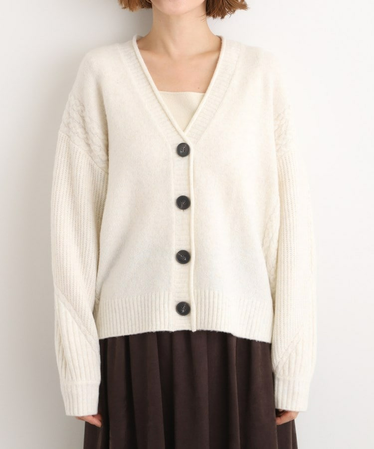 身頃は天竺編みにケーブルを効かせ、袖は畔編みにケーブルを組み合わせた、ニットらしい多彩なテクニックを取り入れたカーディガンです。
