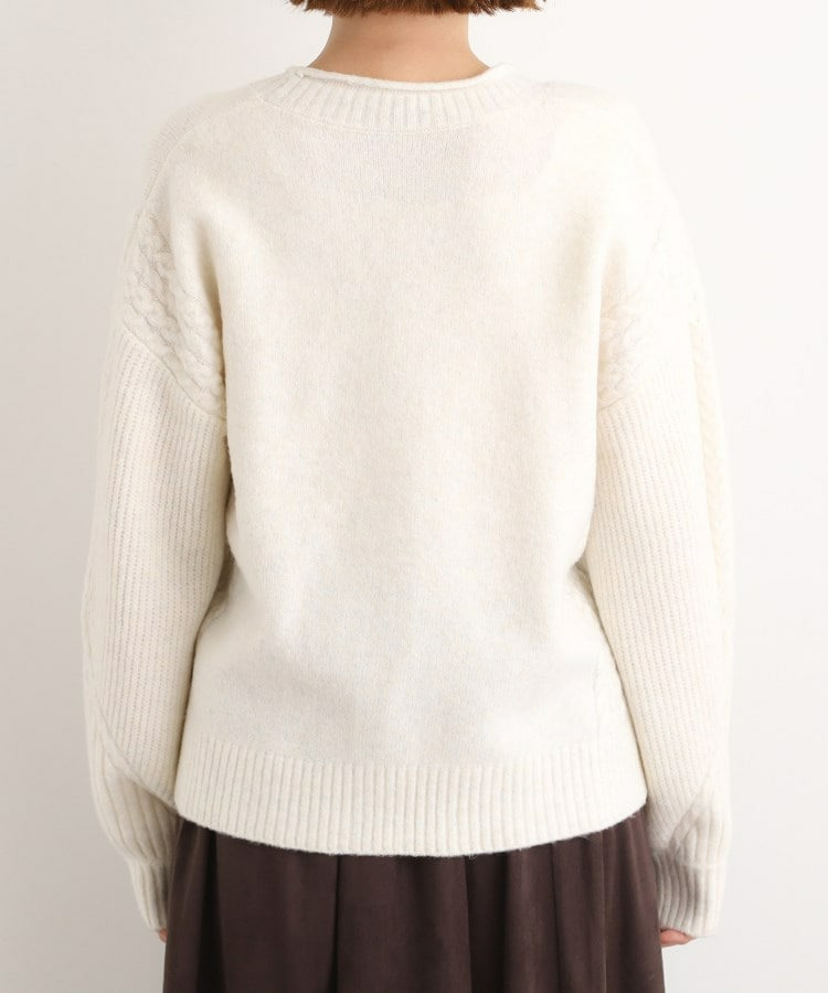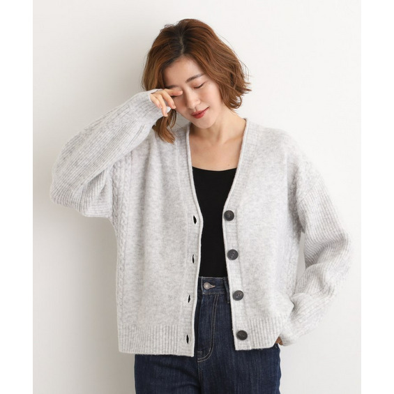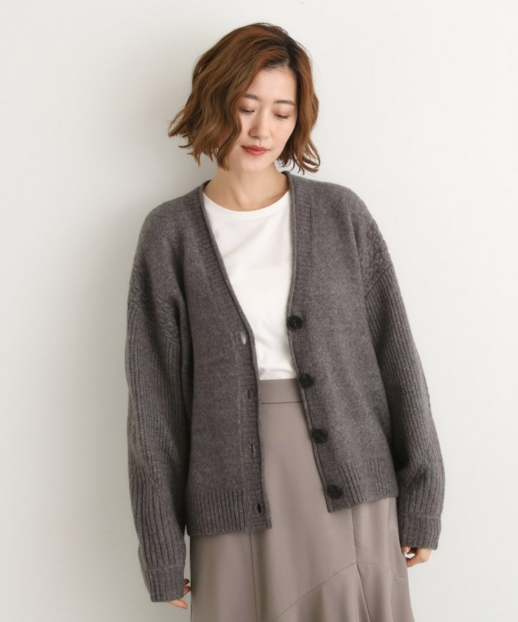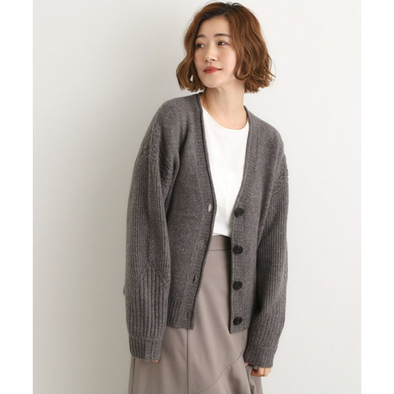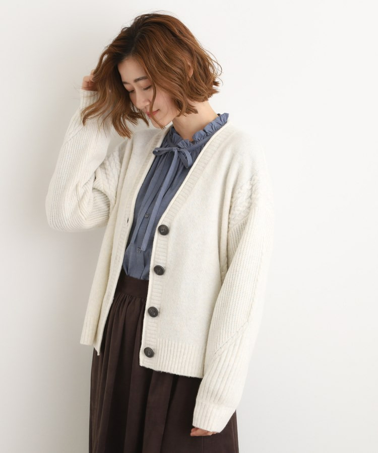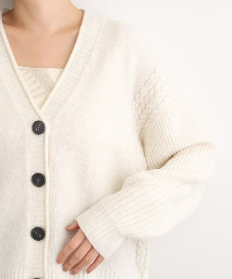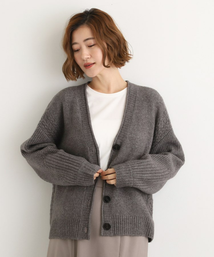身頃は天竺編みにケーブルを効かせ、袖は畔編みにケーブルを組み合わせた、ニットらしい多彩なテクニックを取り入れたカーディガンです。