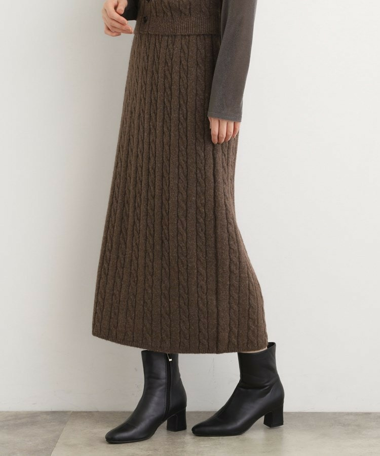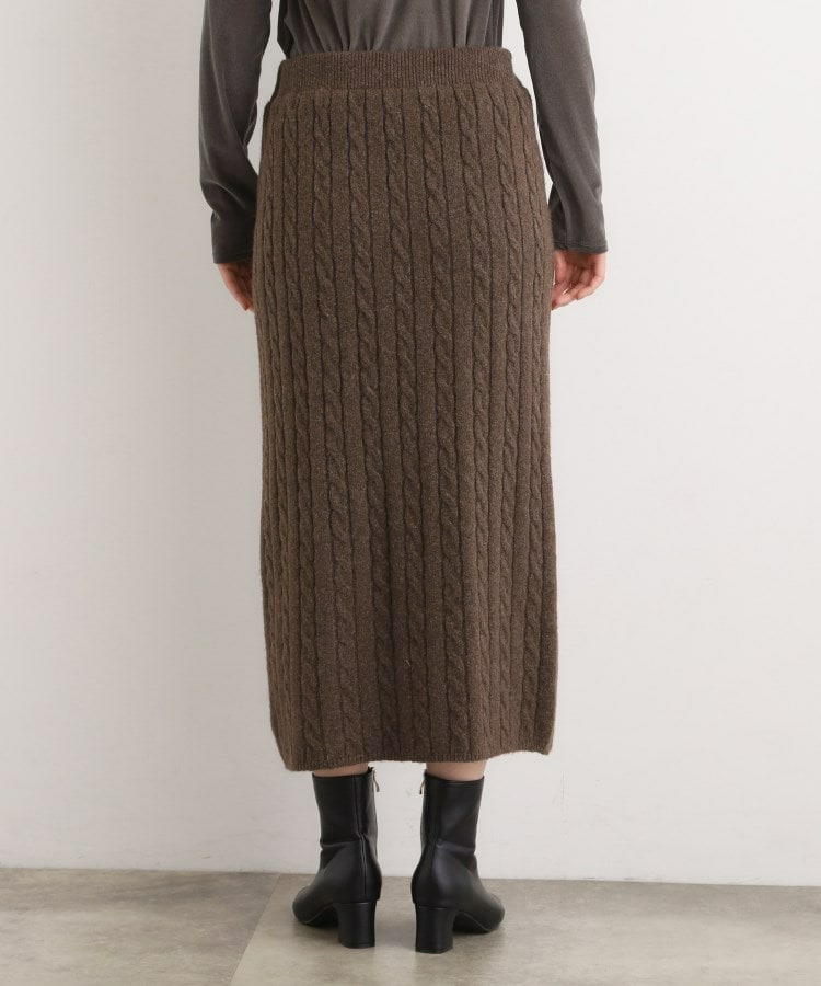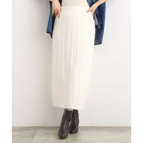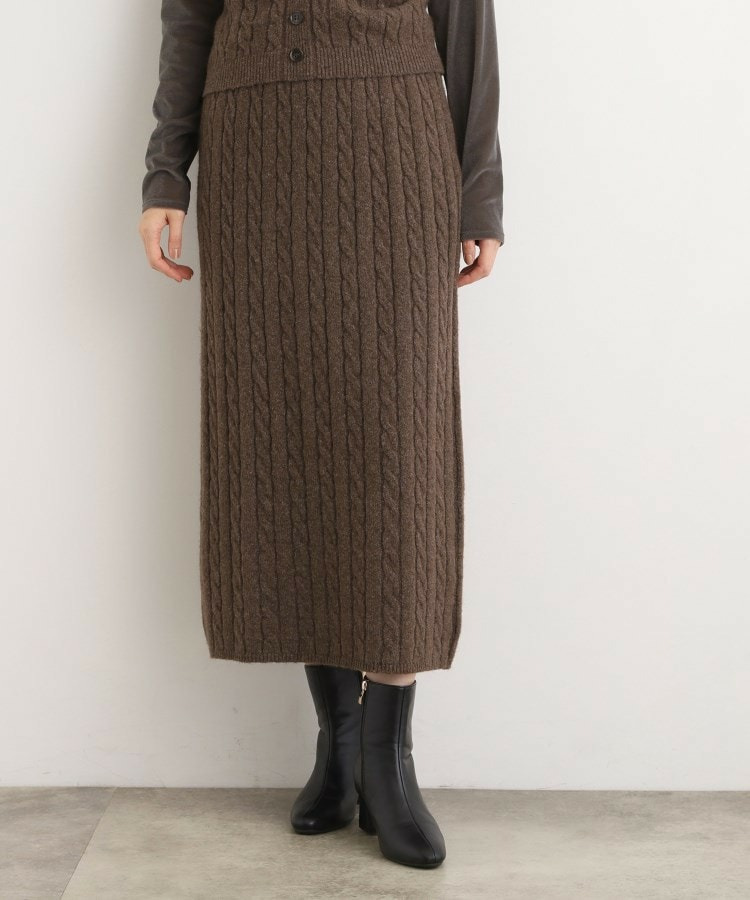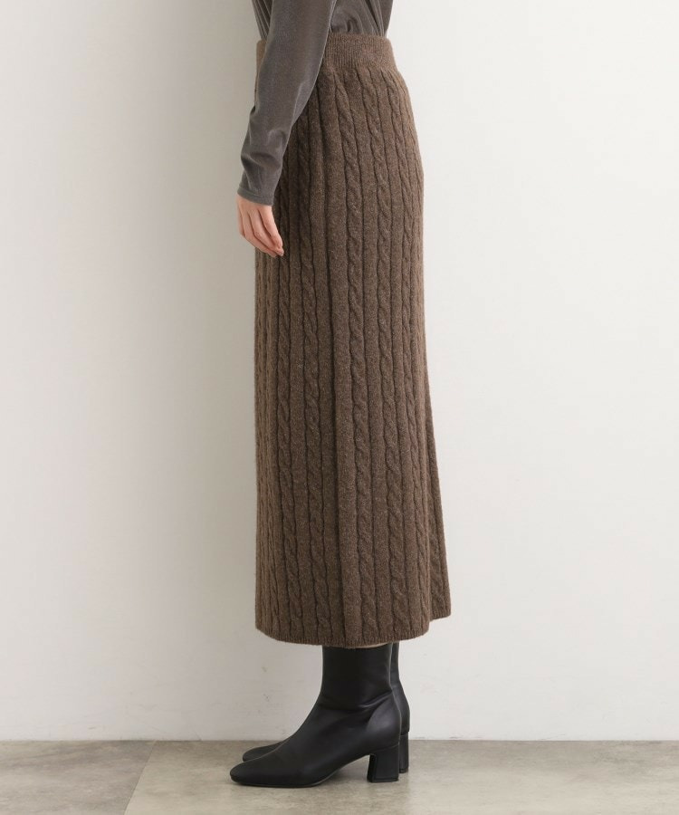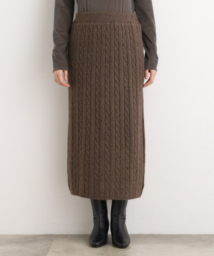 縦ラインを強調するナローシルエットに、立体感のあるケーブル編みを施したマキシ丈ニットスカート。