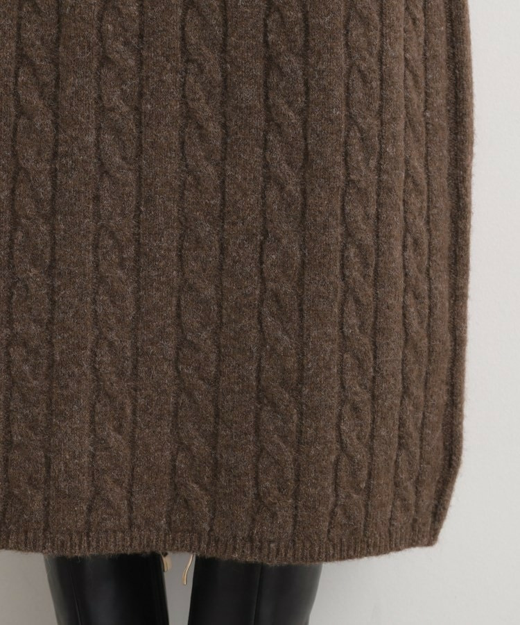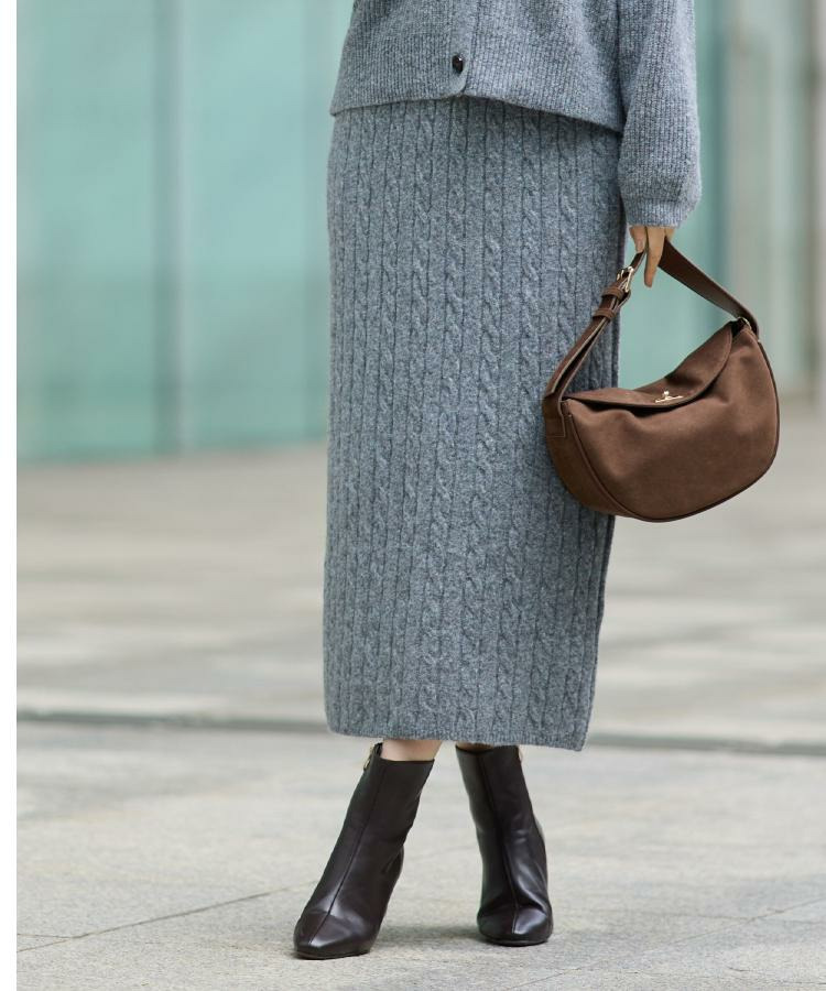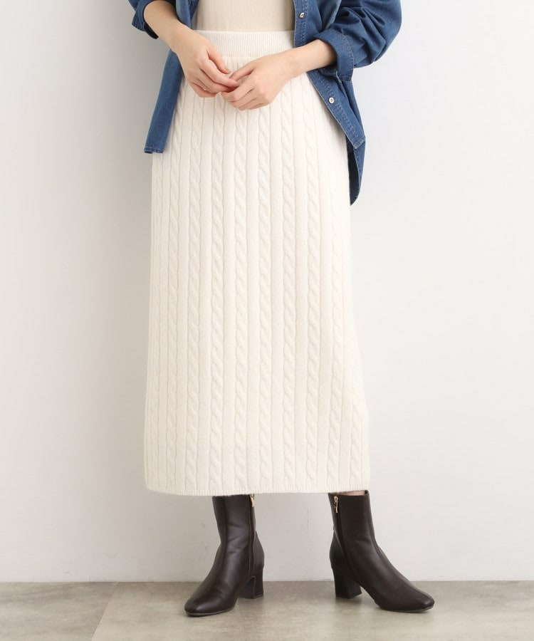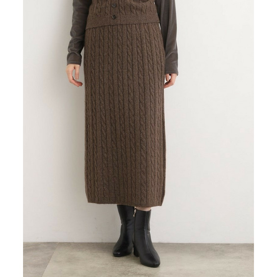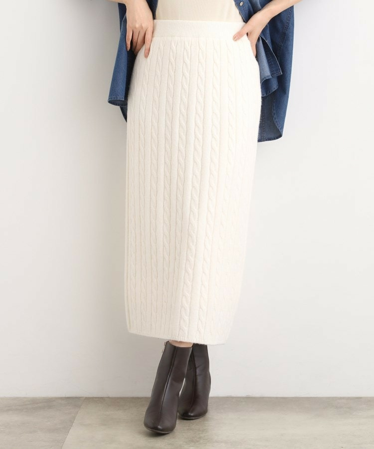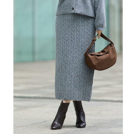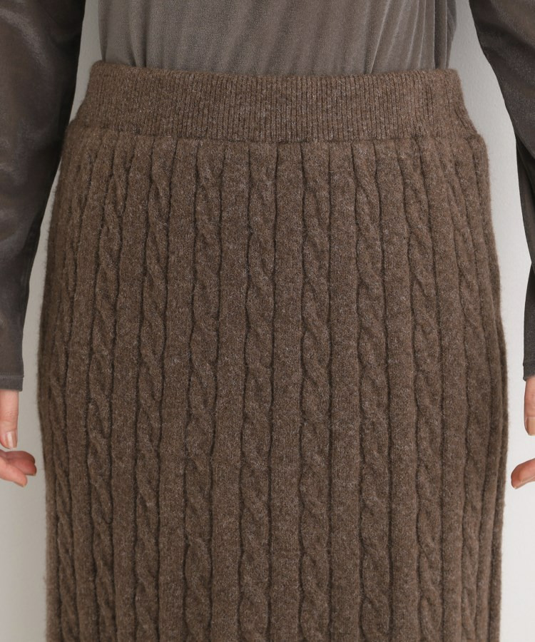 縦ラインを強調するナローシルエットに、立体感のあるケーブル編みを施したマキシ丈ニットスカート。