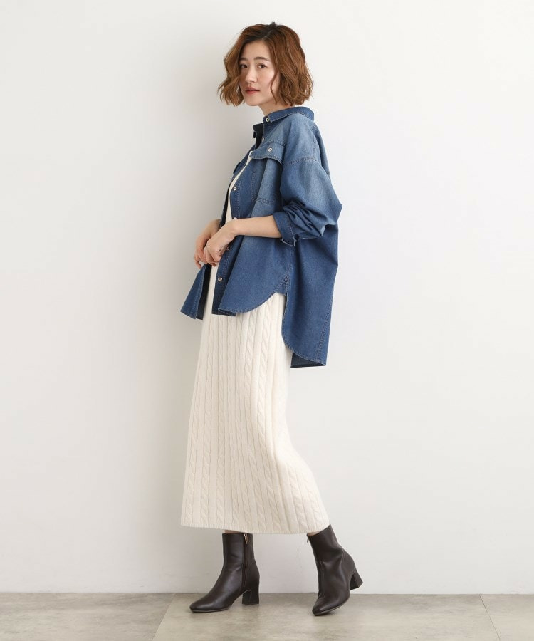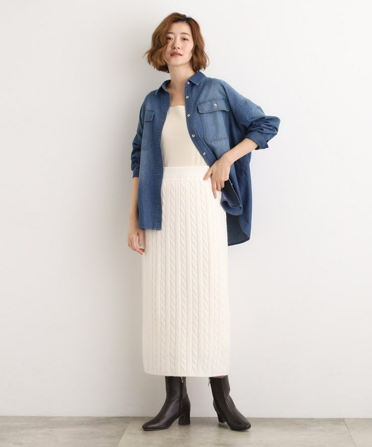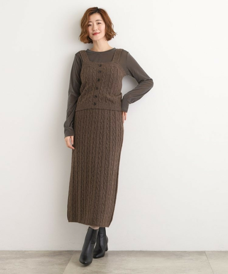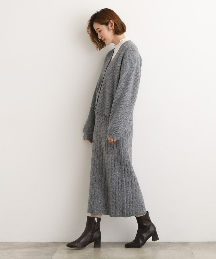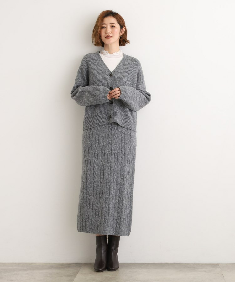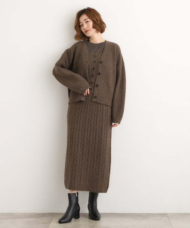 同素材のケーブルキャミビスチェや畔編みカーディガンとのセットアップで着映えするスタイルが完成。