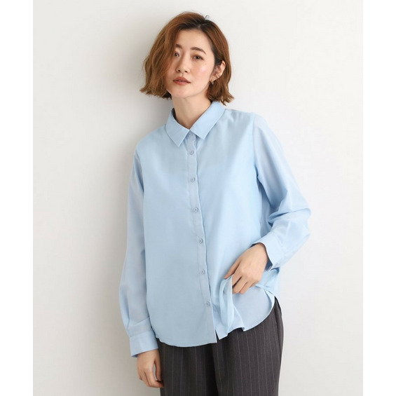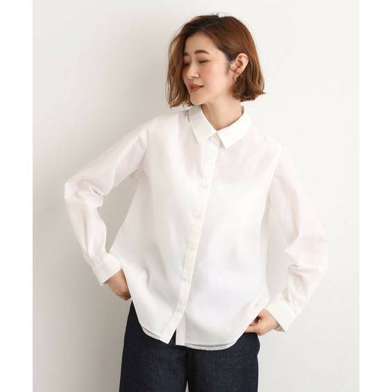 端正な長袖シャツに、衿と前身頃へオーガンジーを重ねたトラッドテイストの一枚です。