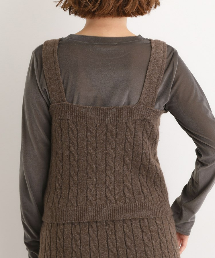 同素材のケーブルニットスカートやカーディガンとセットアップで着用すれば、存在感あるスタイリングが完成。