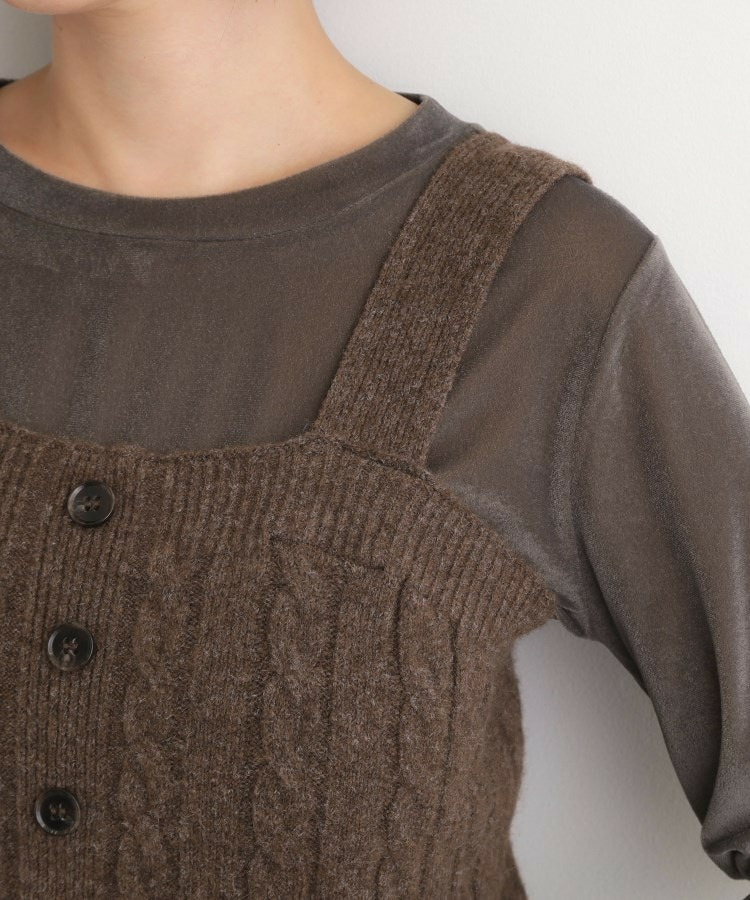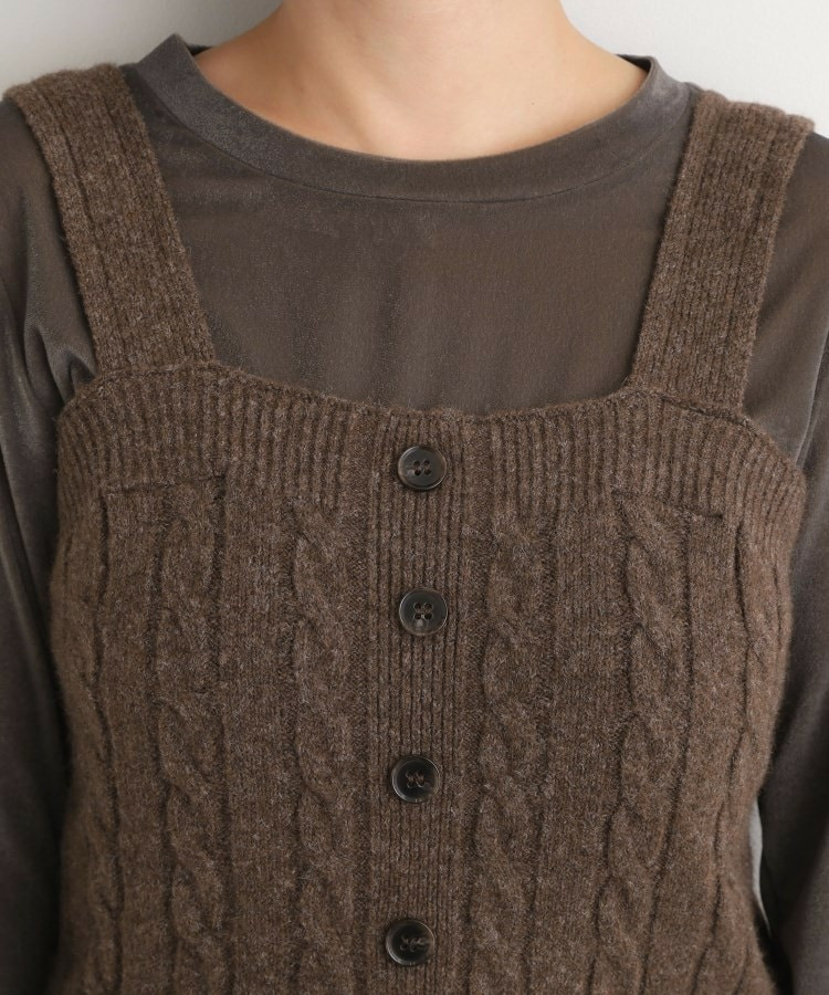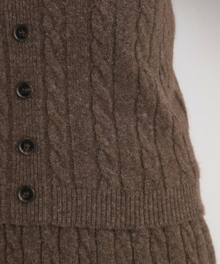 立体感あるケーブル編みに、前立て風デザインと水牛調ボタンをあしらったクラシカルな表情のビスチェ。