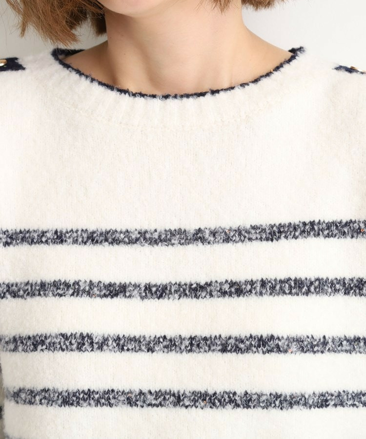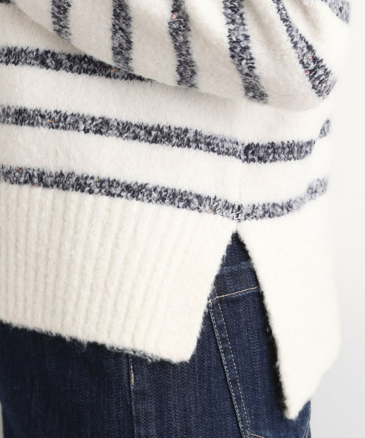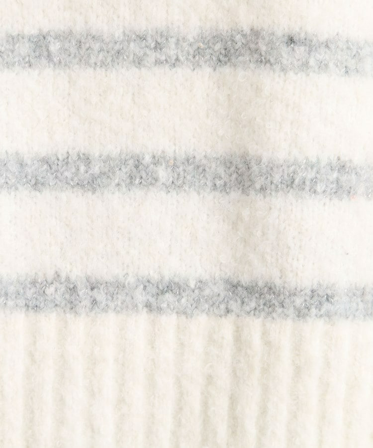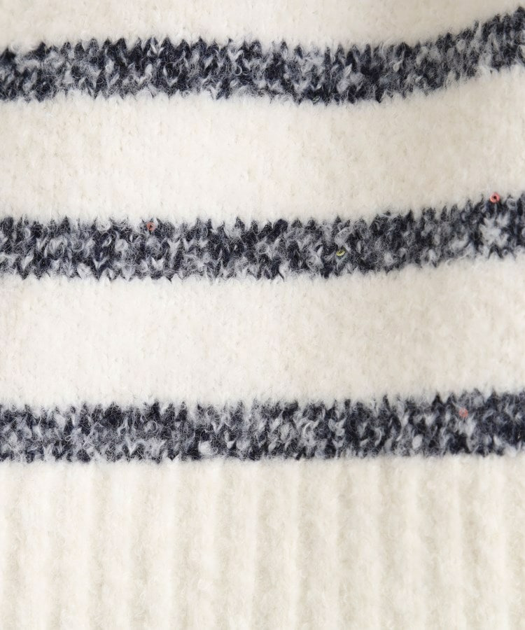 ふんわりとした表情を生むブークレ糸に、ボーダー部分ではラメスパンコールを引き揃えて編み上げました。