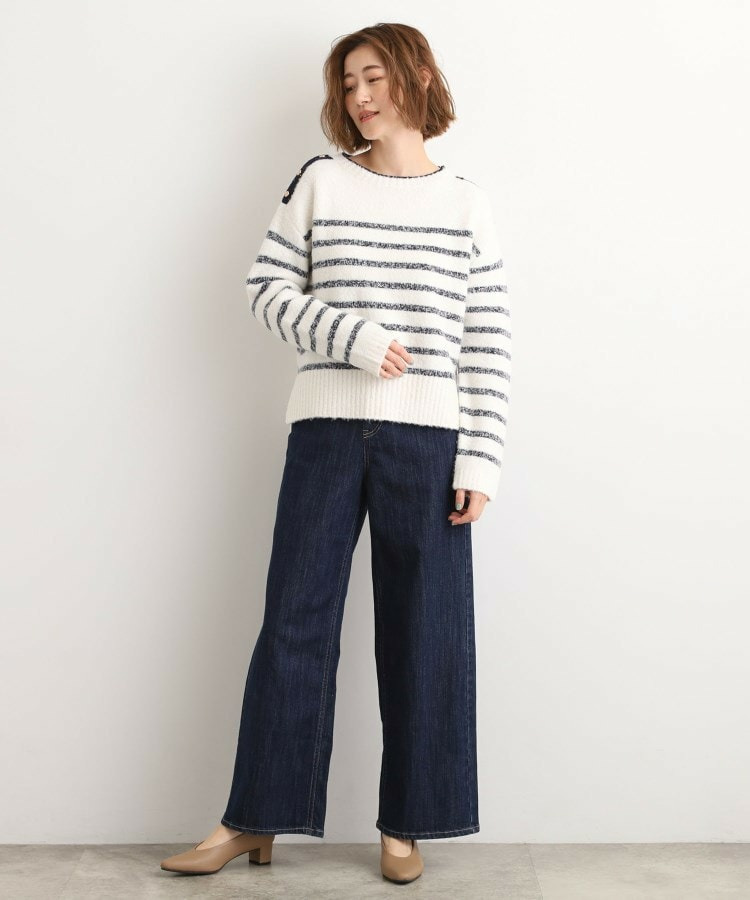 肩には肩章風のディテールと金釦を添え、クラシカルなマリンテイストを表現。
