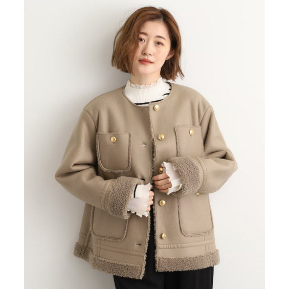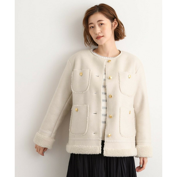 ノーカラー仕立てで上品に仕上げたフェイクムートンのボアジャケットです。