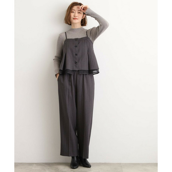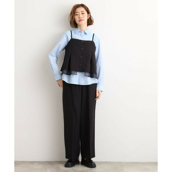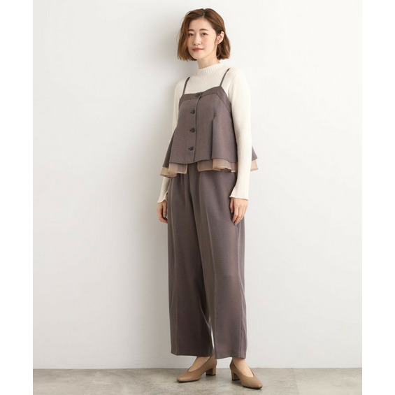 透け感あるオーガンジーを効かせたキャミビスチェと、センタープレス入りワイドパンツのセットアップ。