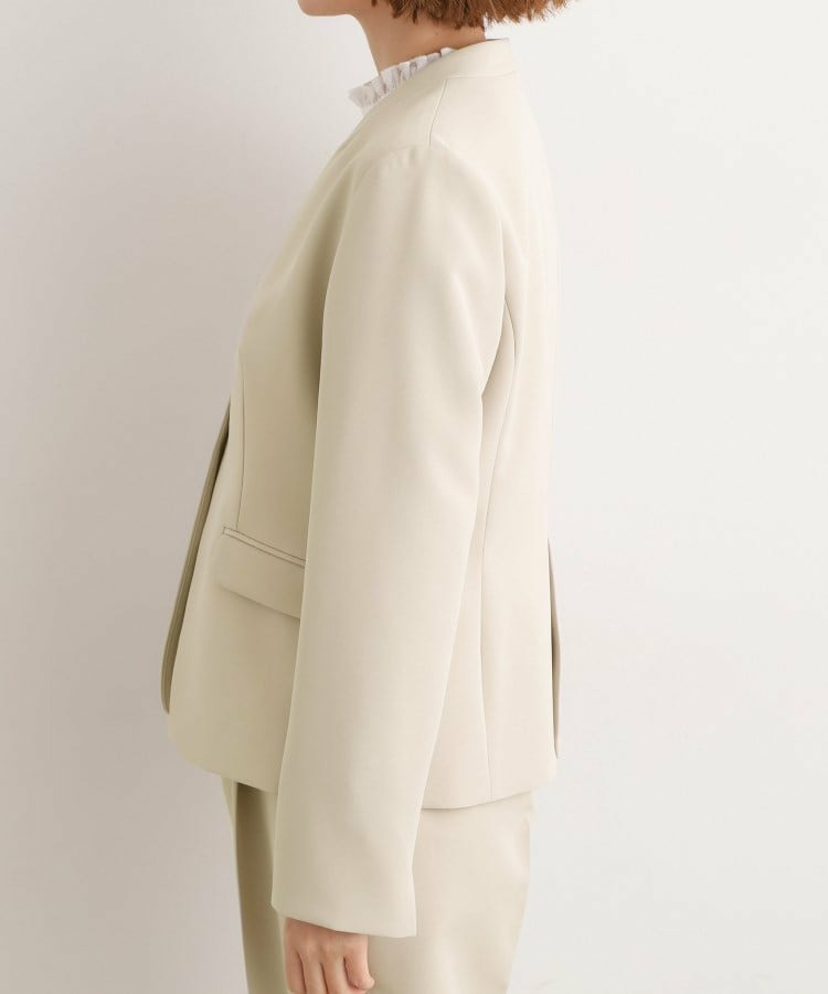 すっきりとしたV開きのノーカラーデザインで、顔まわりをシャープに見せてくれます。