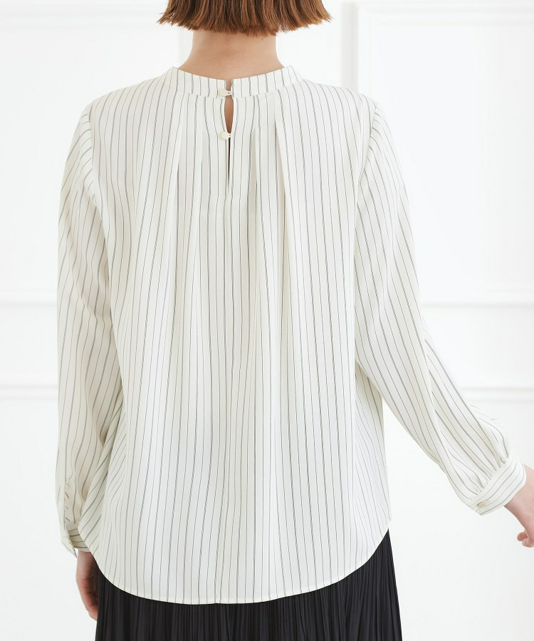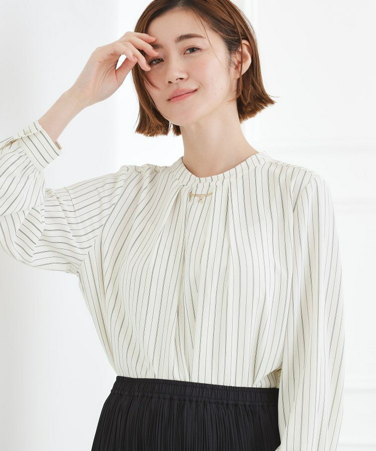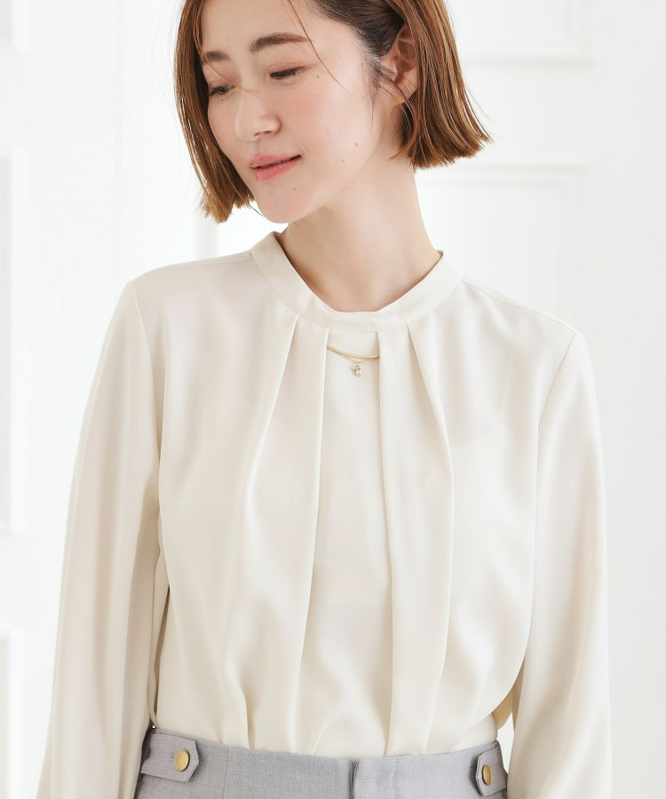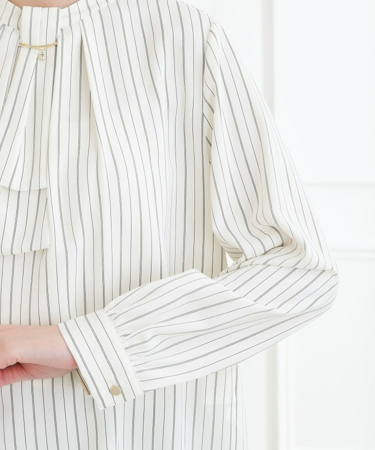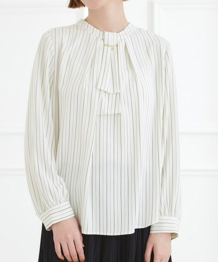 ボウタイは内側にしまうこともできる、シンプルなタックネックデザインのブラウスとしても楽しめます。