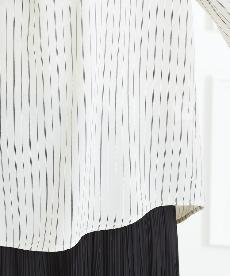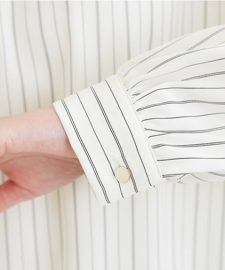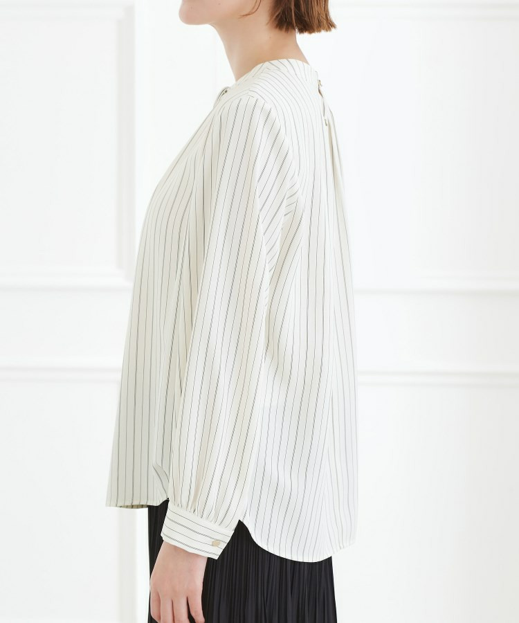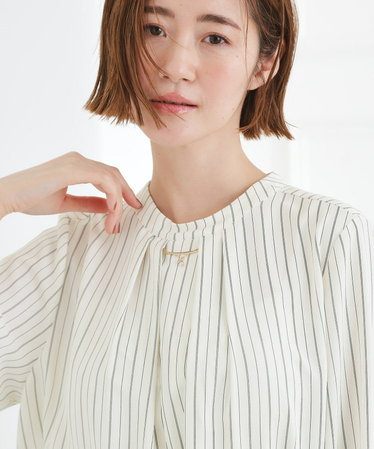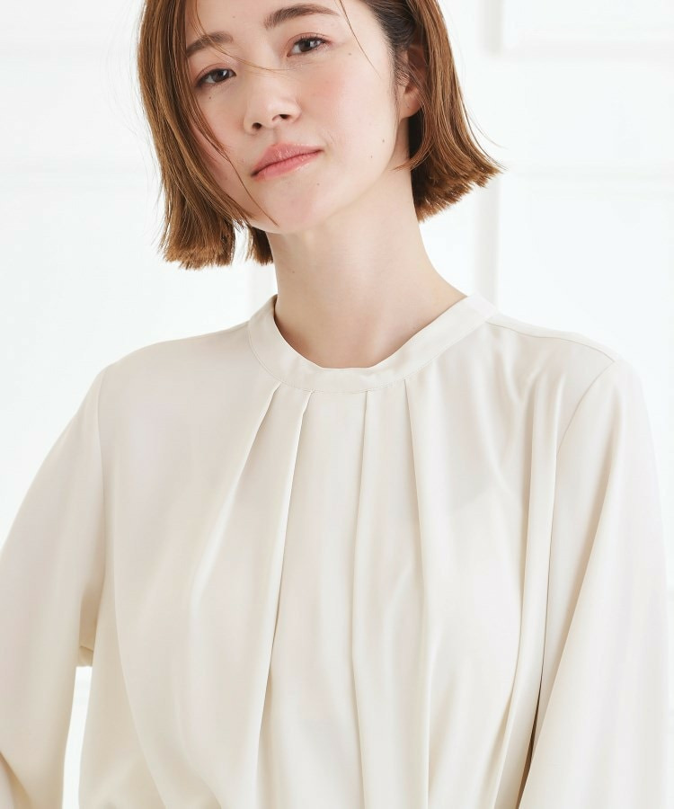 ボウタイは内側にしまうこともできる、シンプルなタックネックデザインのブラウスとしても楽しめます。