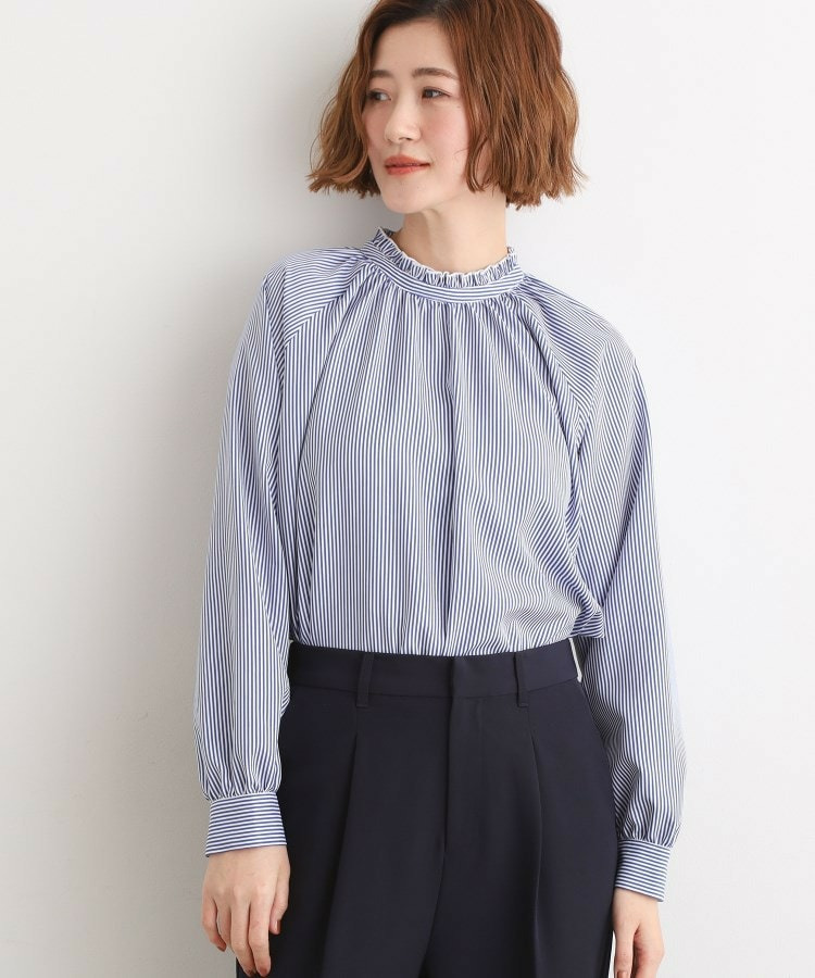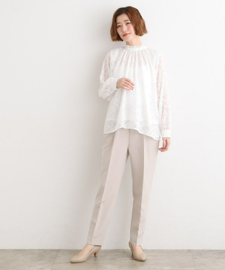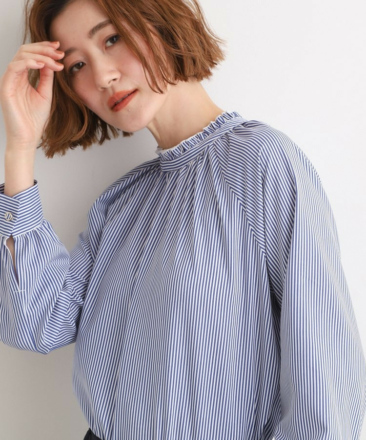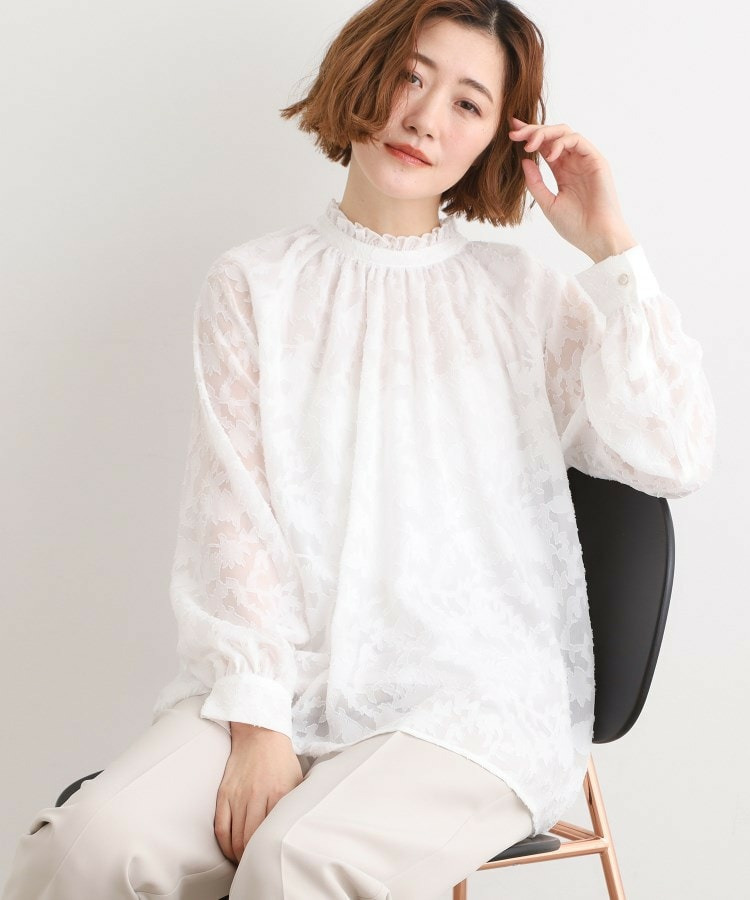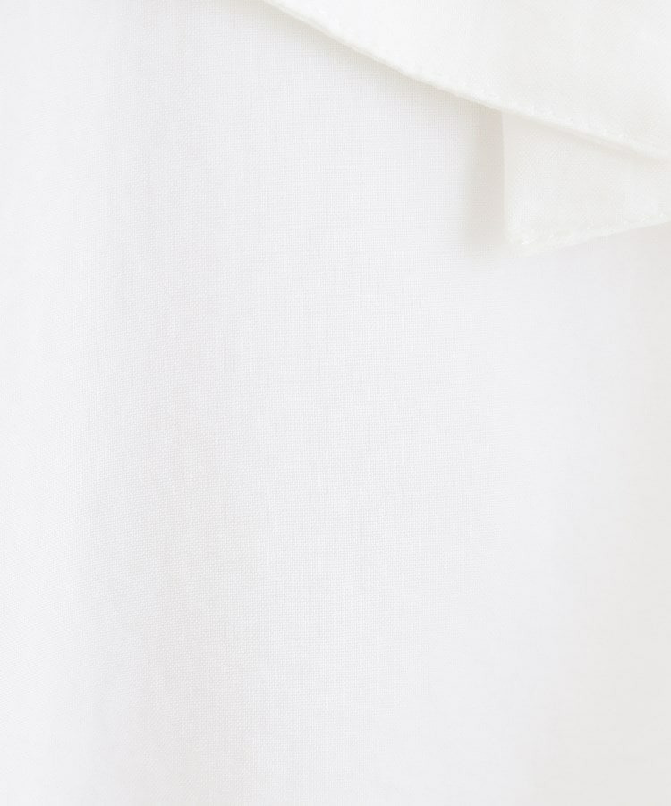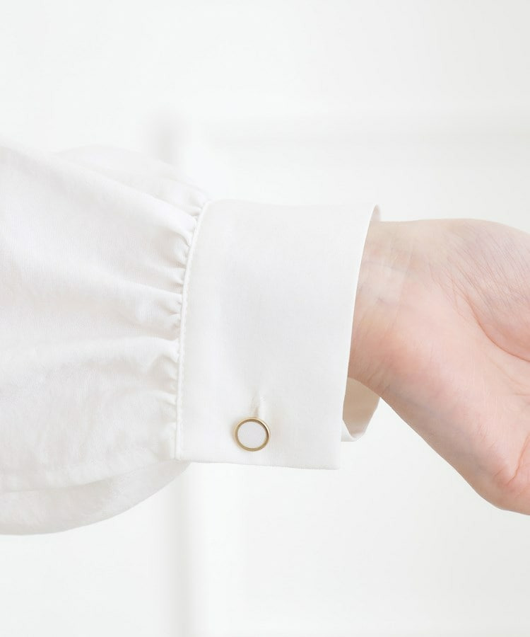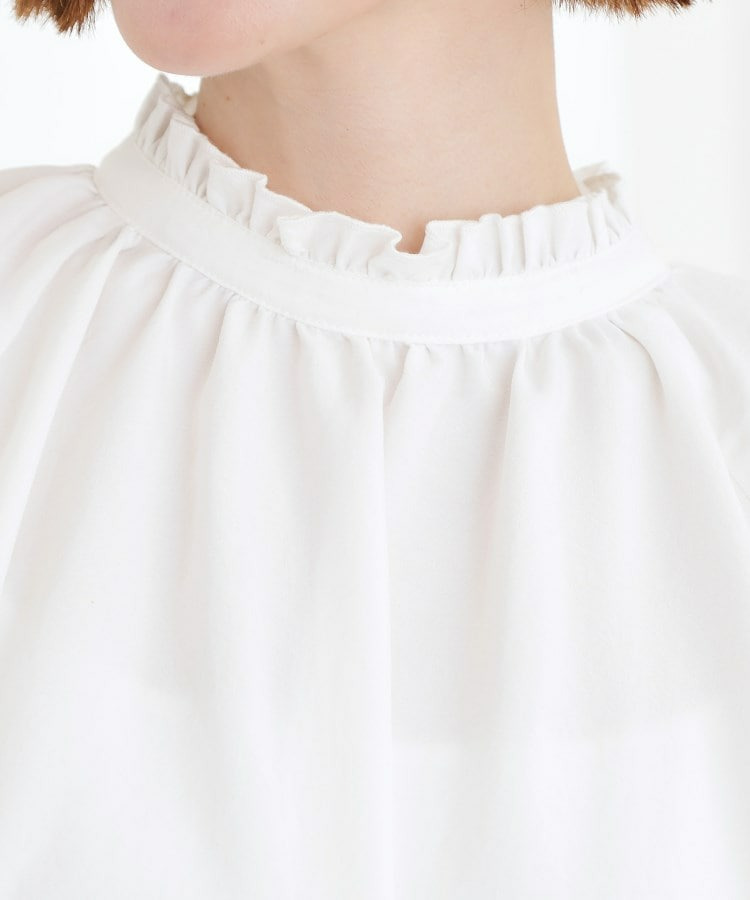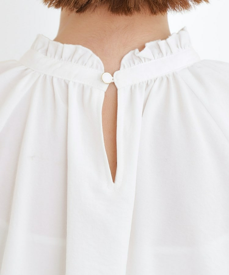 スタンドネックには細やかなギャザーとフリルを施し、顔まわりに柔らかな華やかさをプラス。