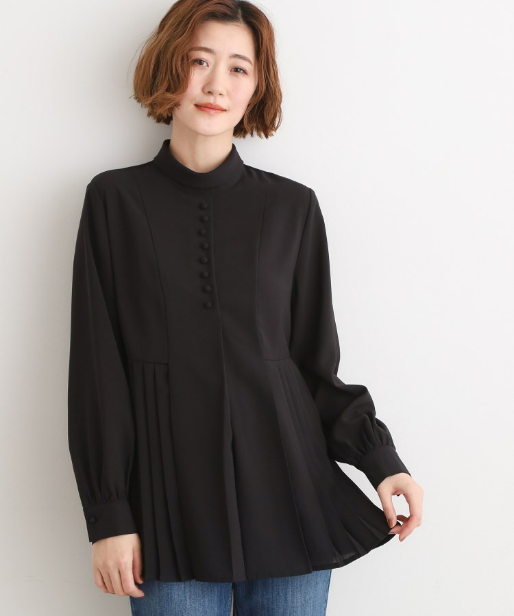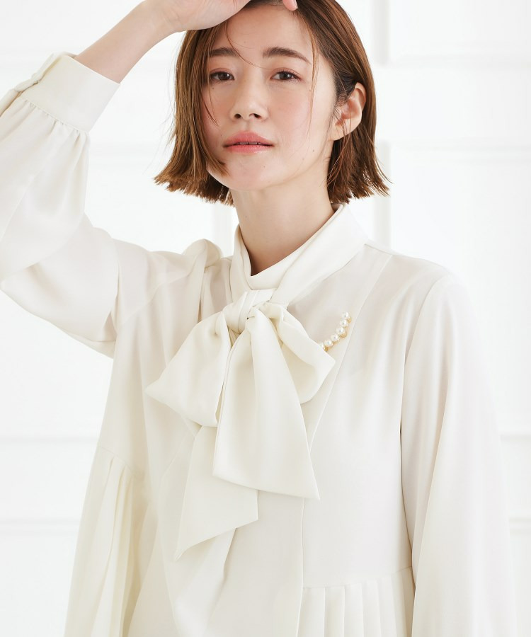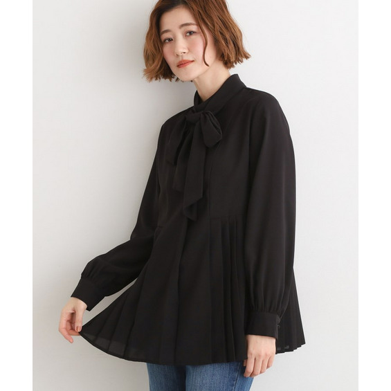 取り外しボウタイで2通りの表情。プリーツチュニックブラウス
