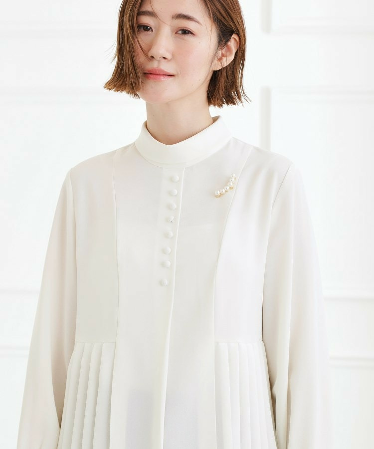 ボウタイを外せばブローチも映えるシンプルなスタンドネックで普段使いにも対応可能。