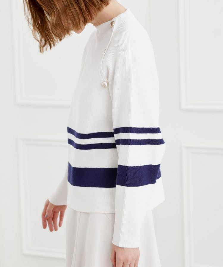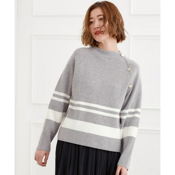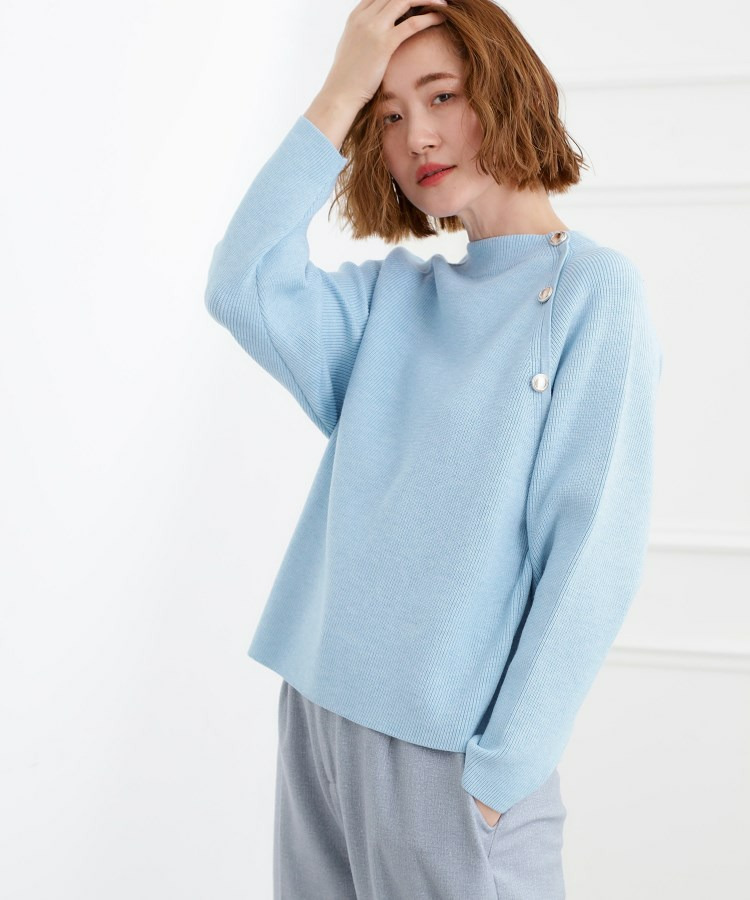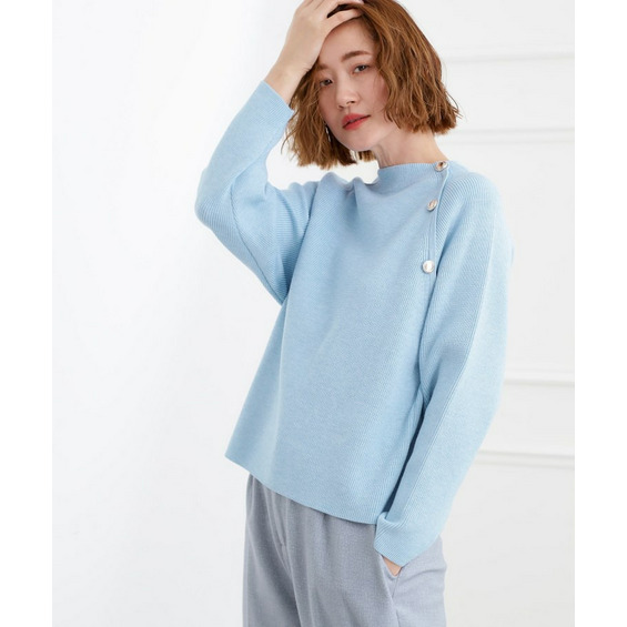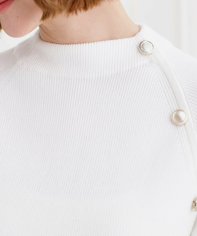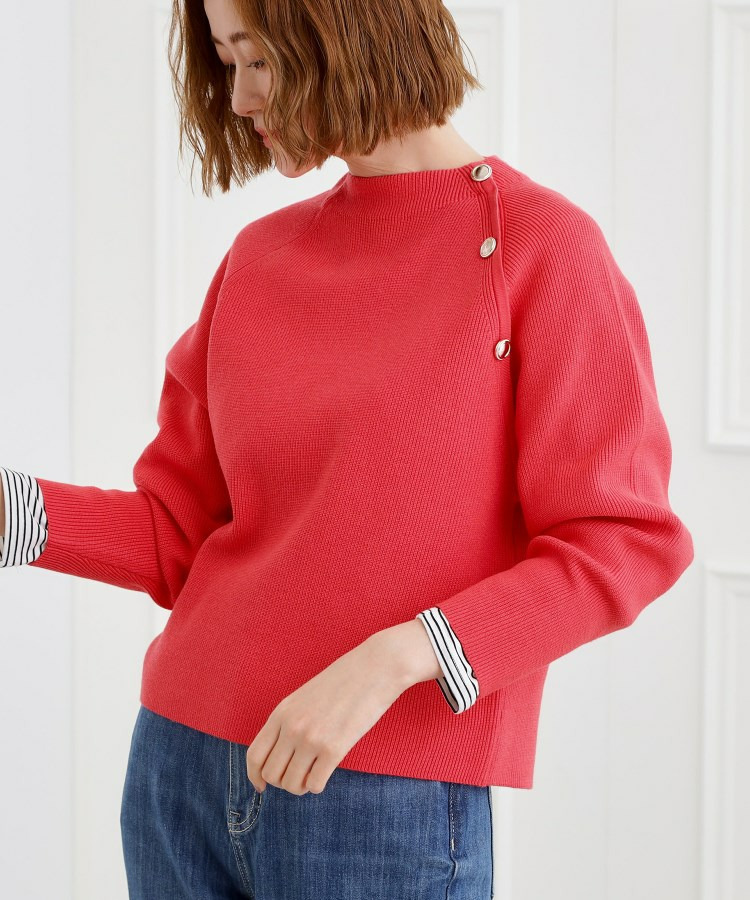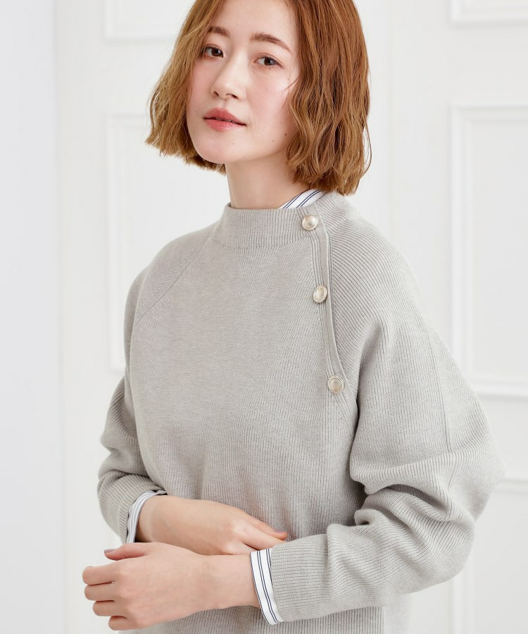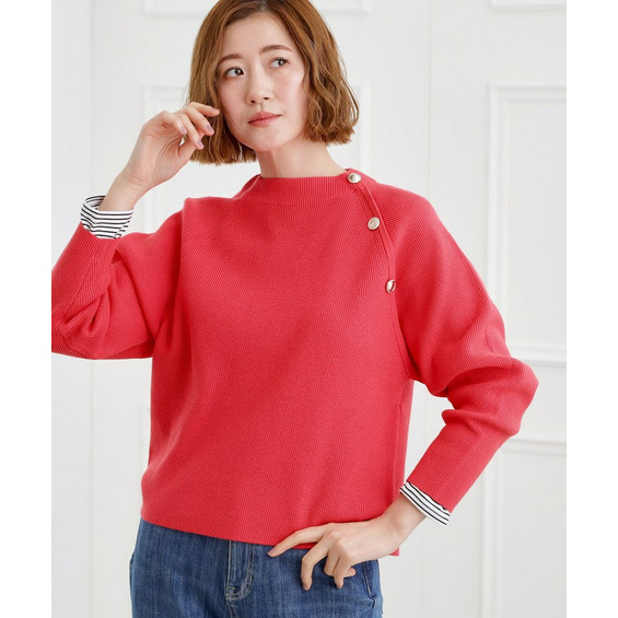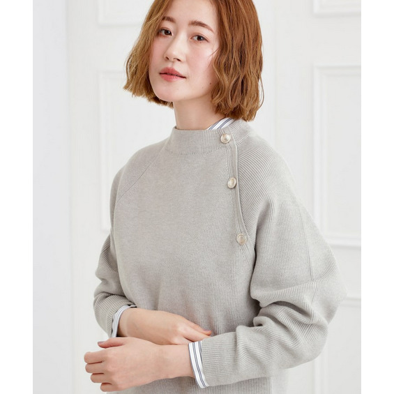 肩にあしらった金釦がアクセントになり、トラッドなムードを漂わせるニットプルオーバー。