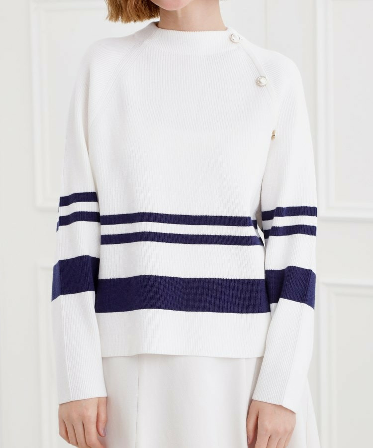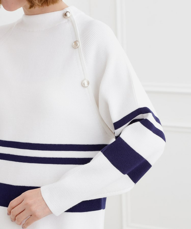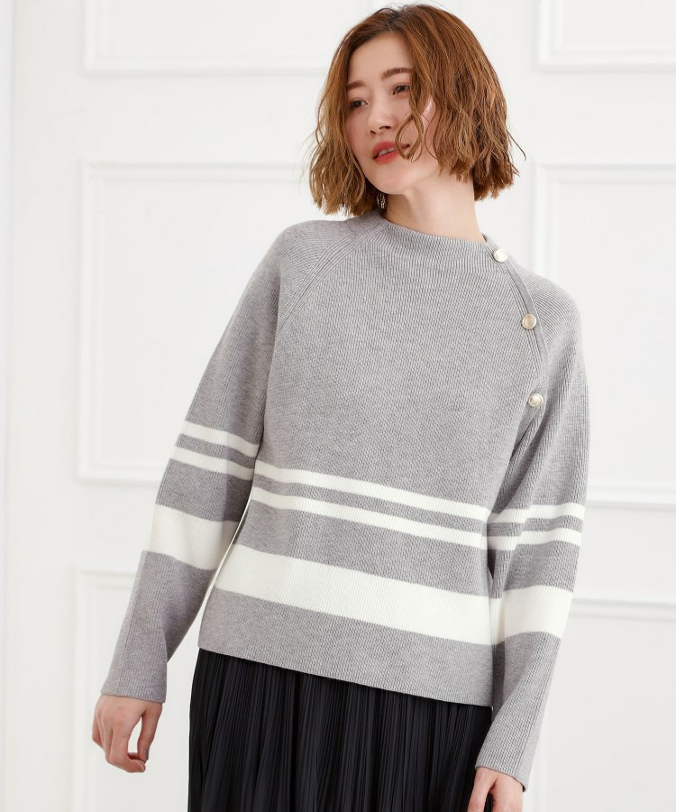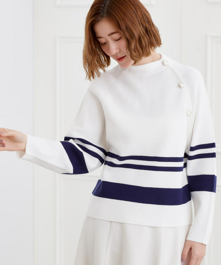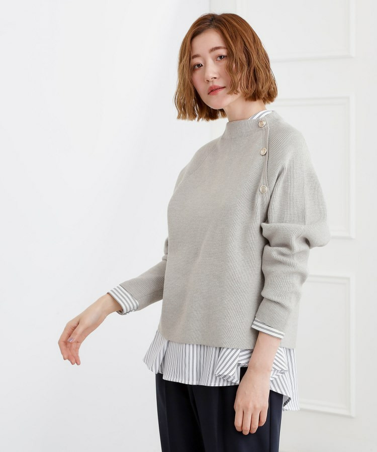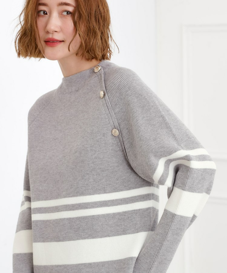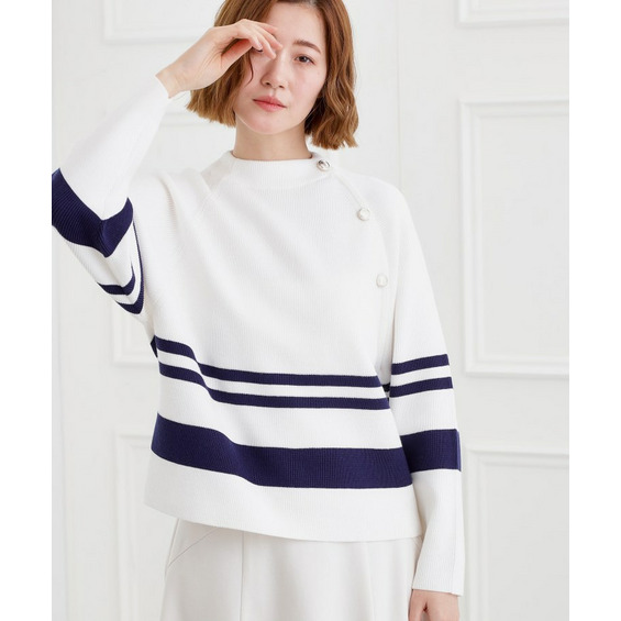 肩にあしらった金釦がアクセントになり、トラッドなムードを漂わせるニットプルオーバー。