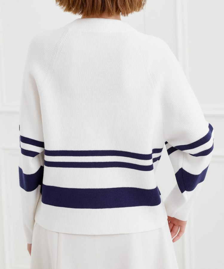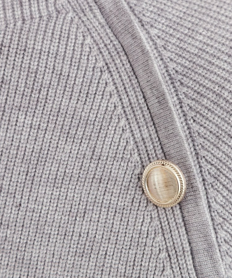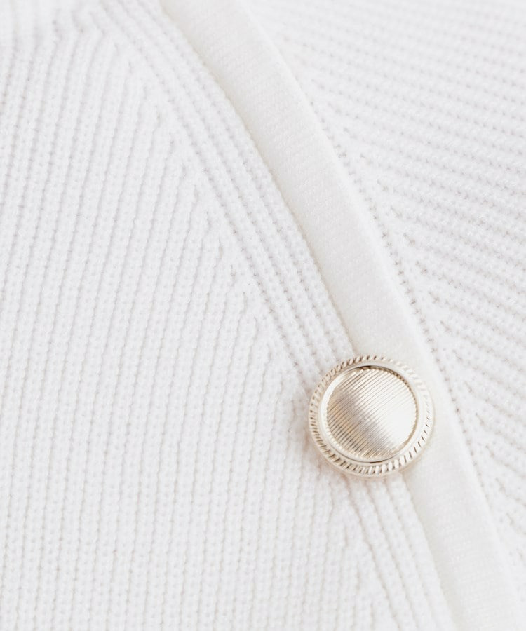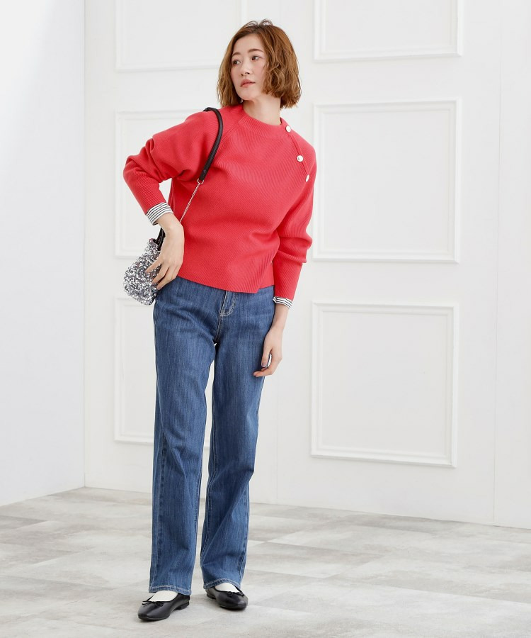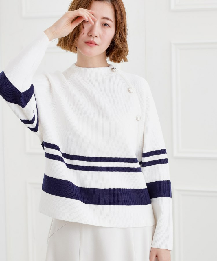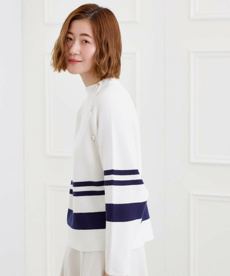 肩にあしらった金釦がアクセントになり、トラッドなムードを漂わせるニットプルオーバー。