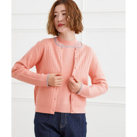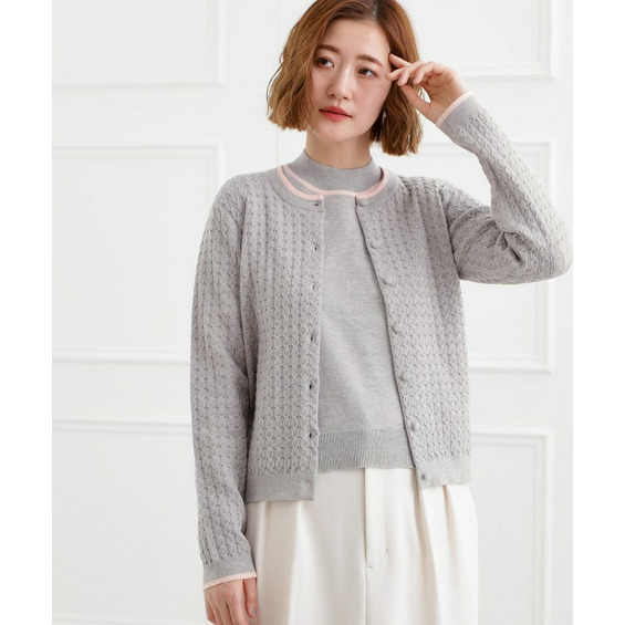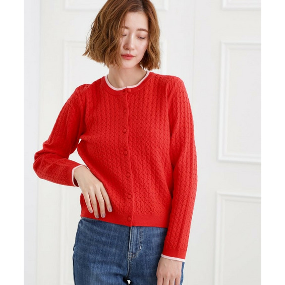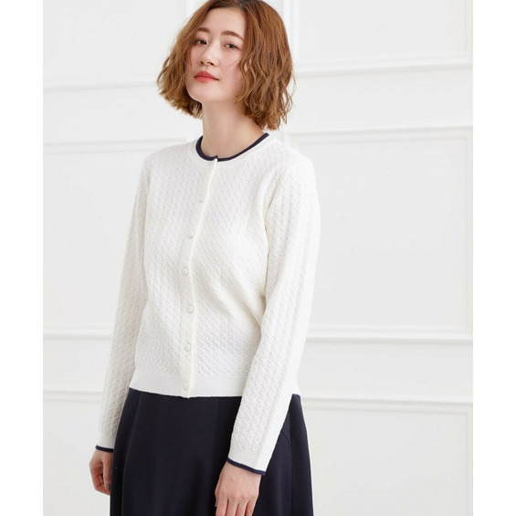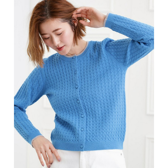 ミニケーブル編みがクラシカルなクルーネックカーディガンです。