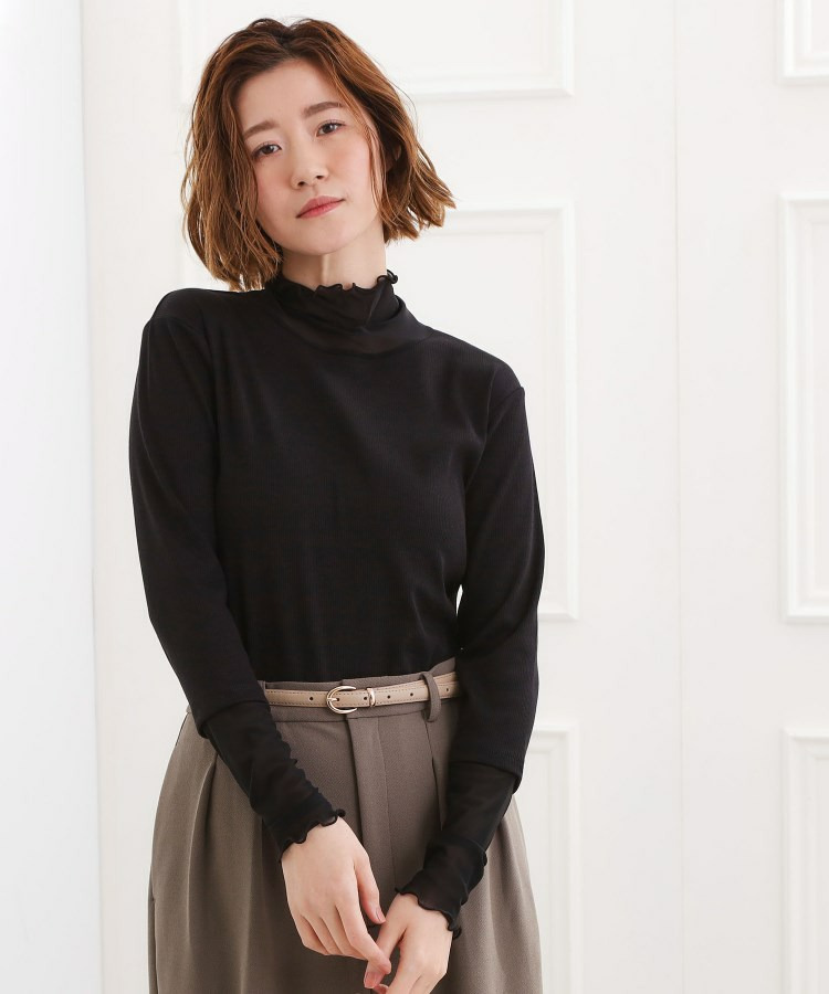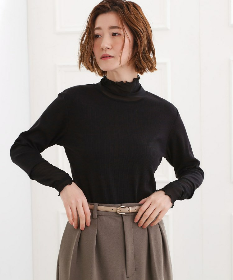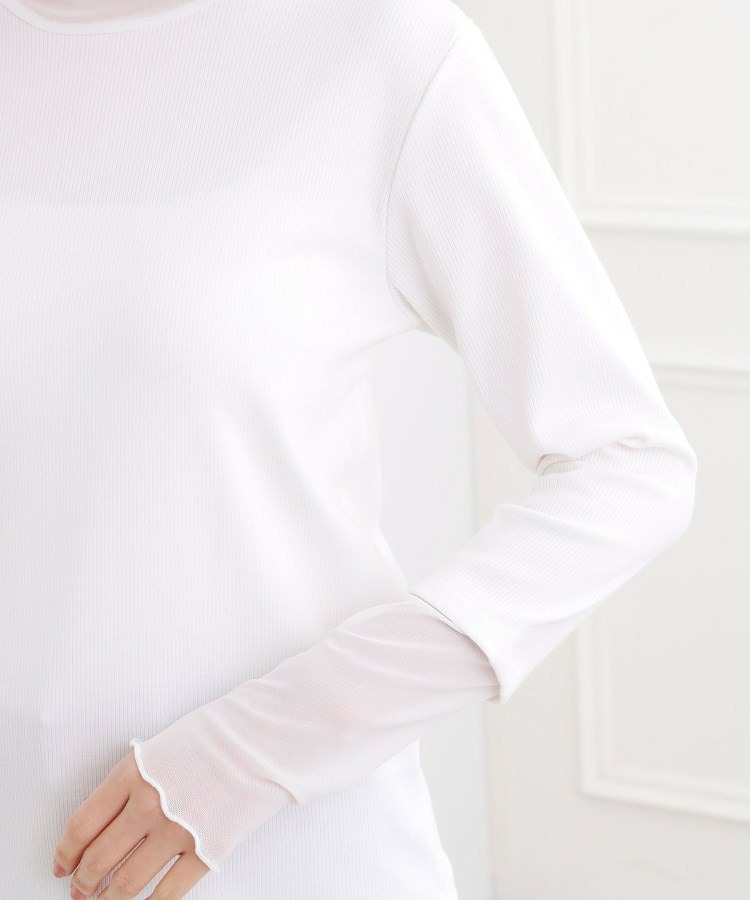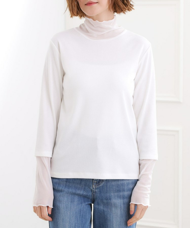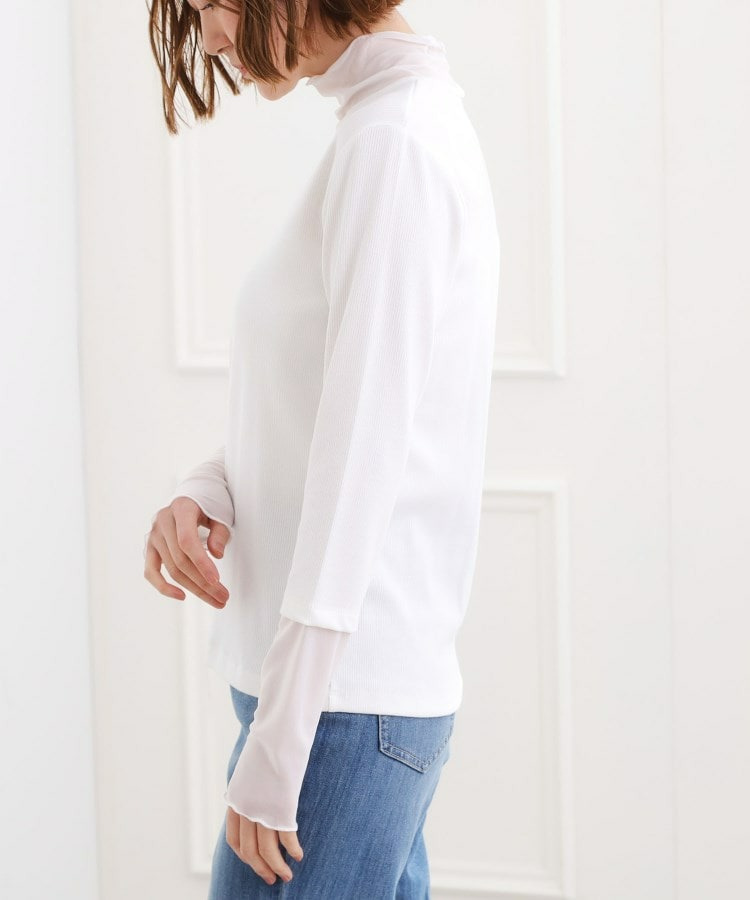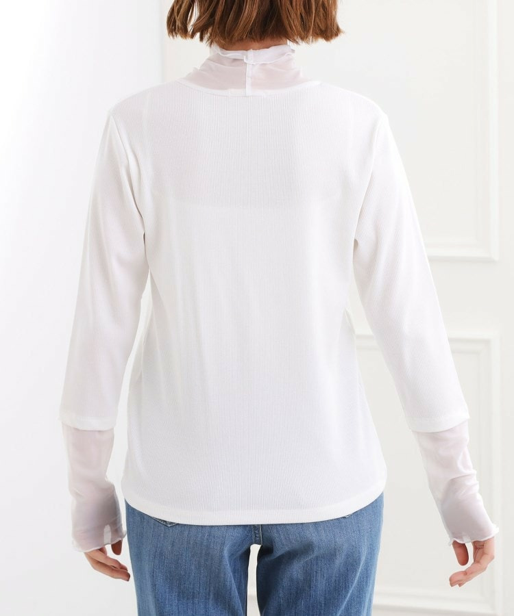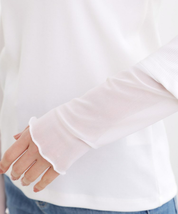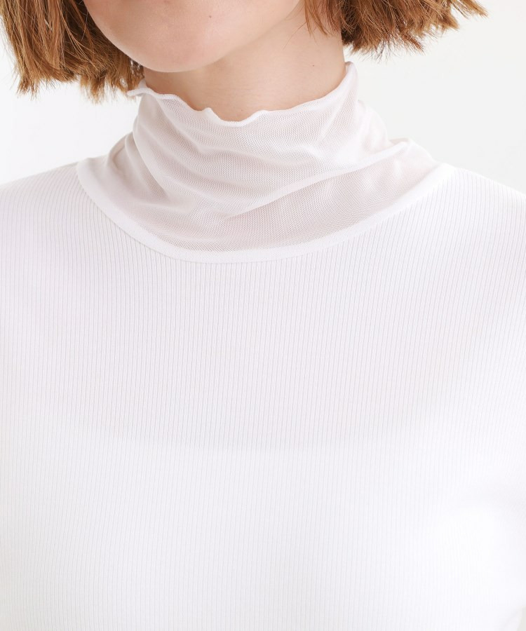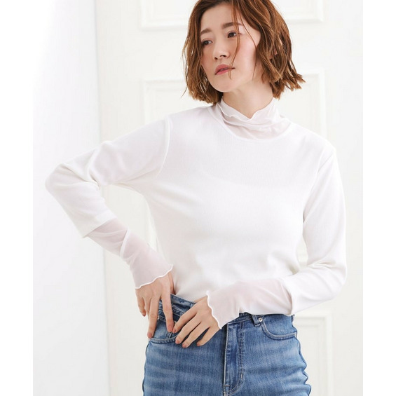 肌馴染みの良いテレコカットソーとシアーメッシュの切り替えデザインの長袖プルオーバー。
