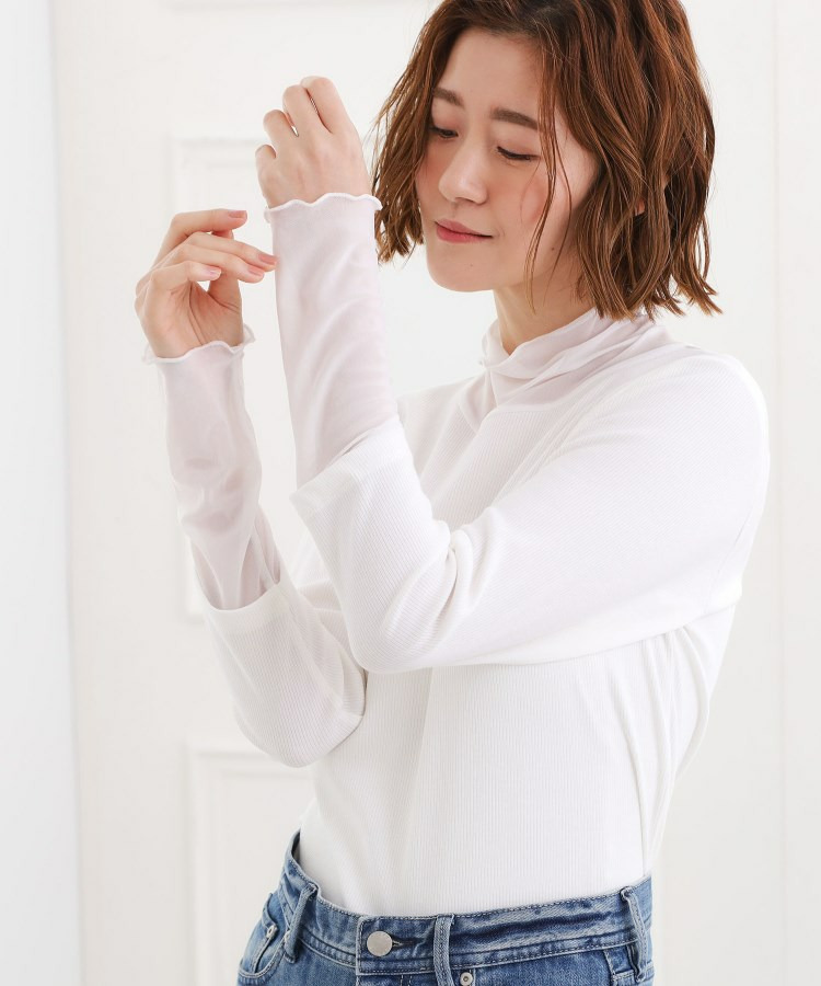 袖口とネックのシアーがトレンド感と程よい抜け感が出て女性らしさをプラスしてくれる1枚です。