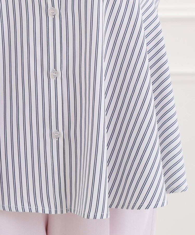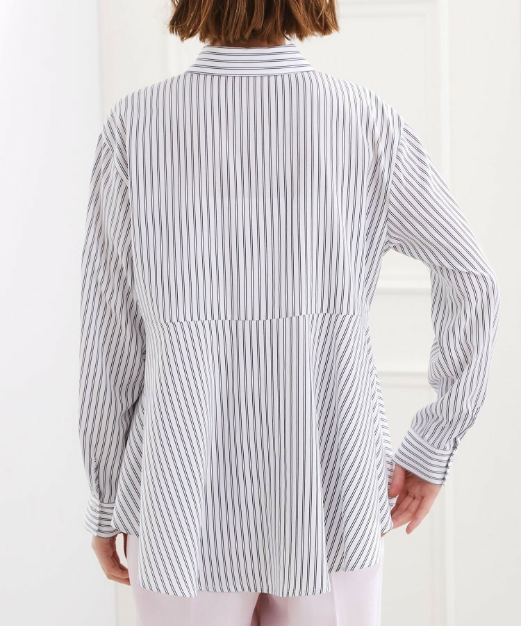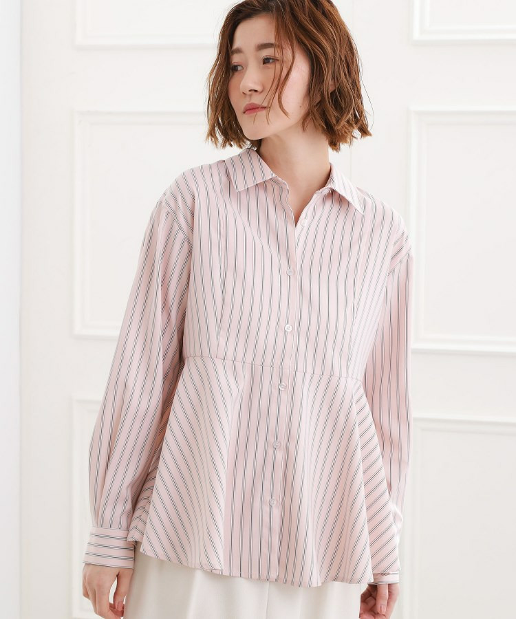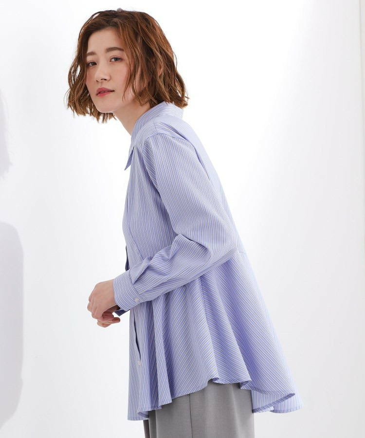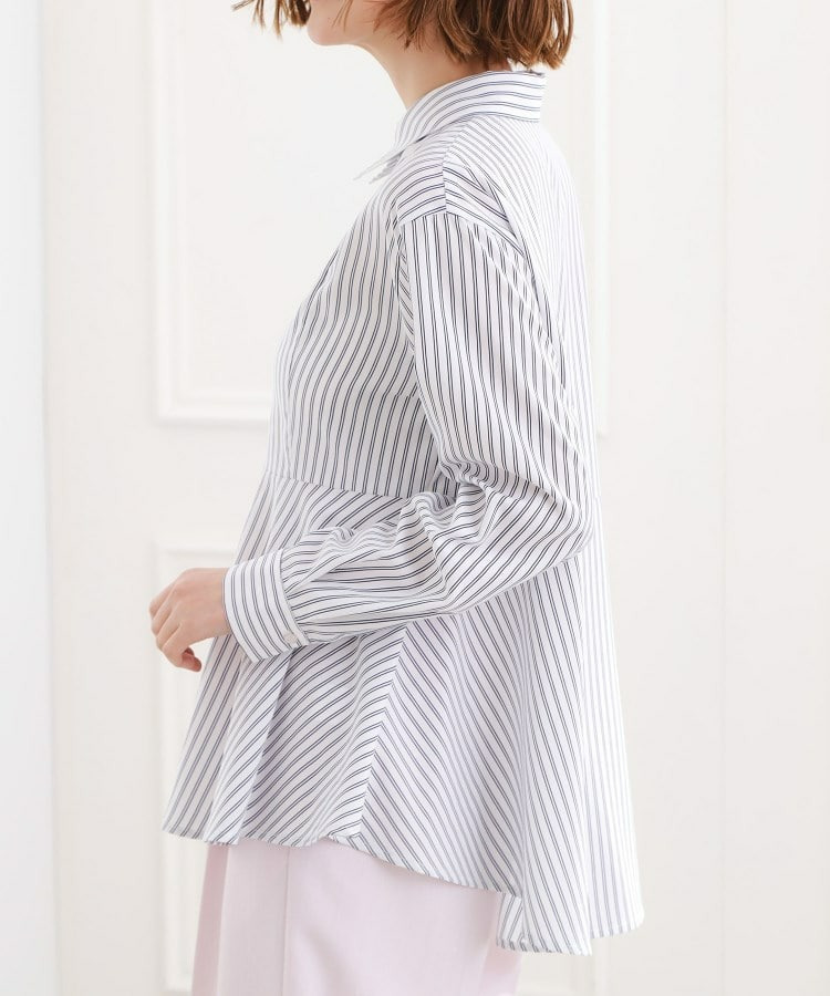 裾のフレアをギャザーではなくフレア展開で仕立てた、華やかなペプラムシルエットのシャツです。