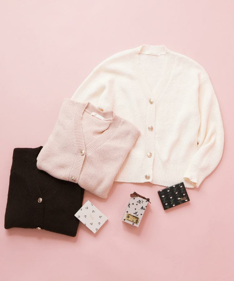 フィリーチョコレートとのコラボレーションで仕上げた、Vネックデザインのブークレニットカーディガンです。