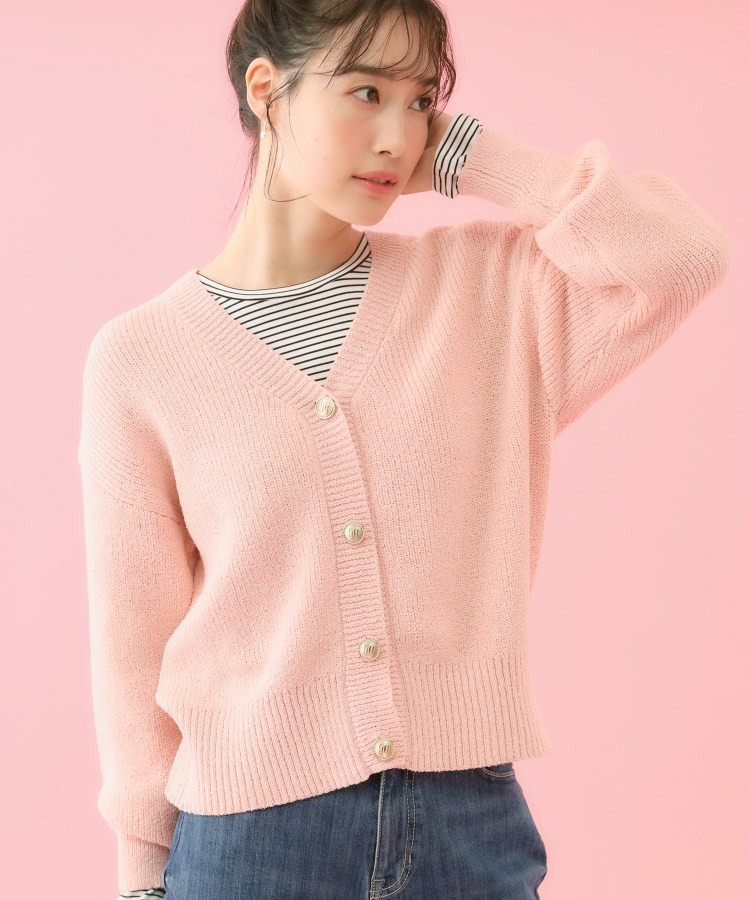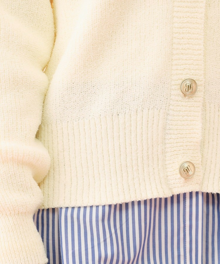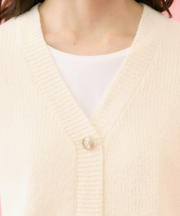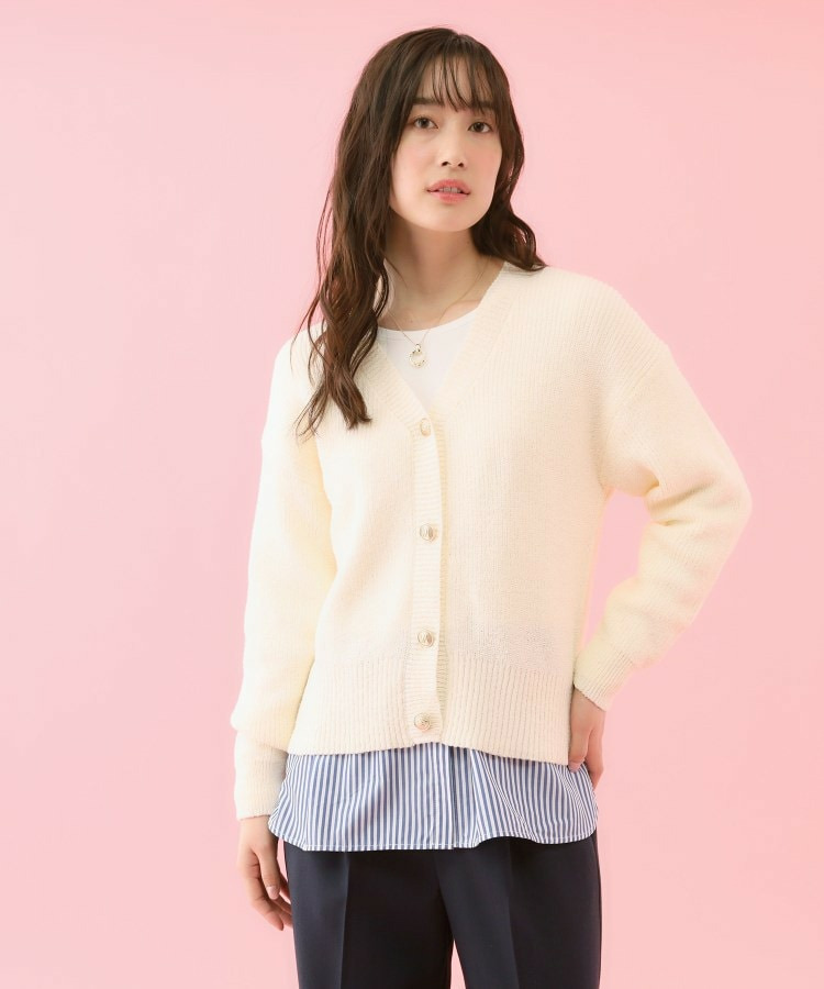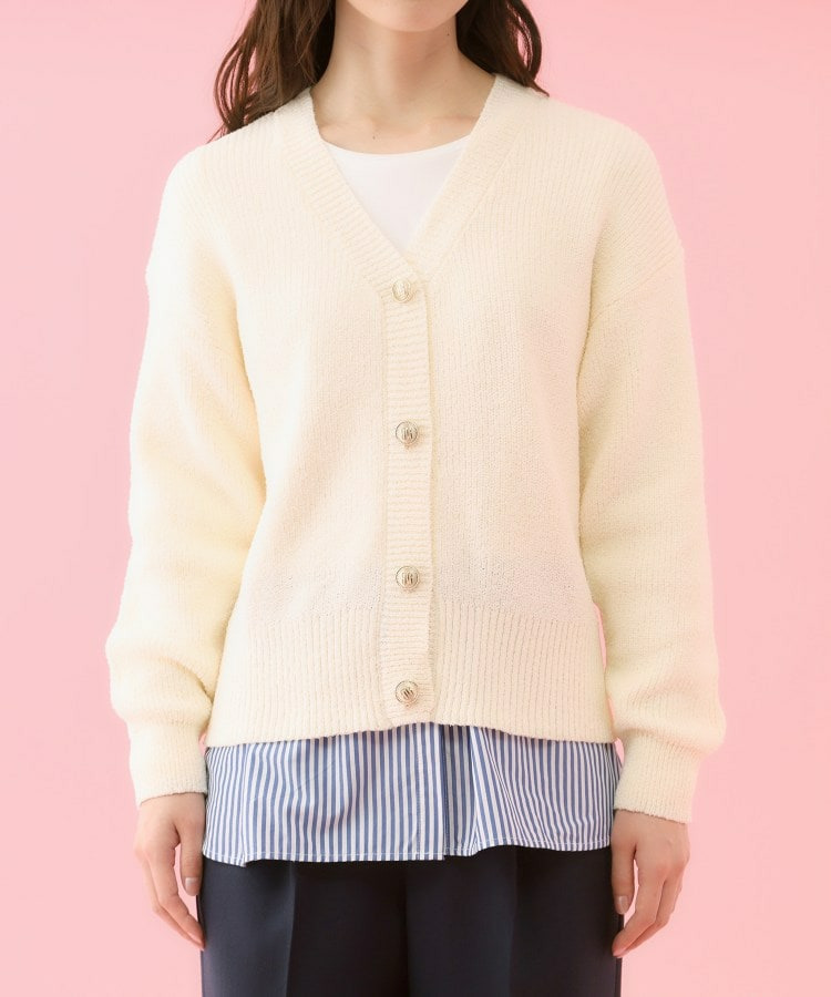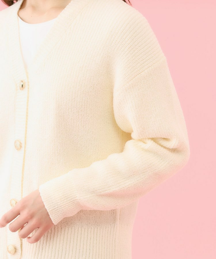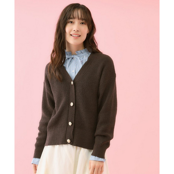 フィリーチョコレートとのコラボレーションで仕上げた、Vネックデザインのブークレニットカーディガンです。
