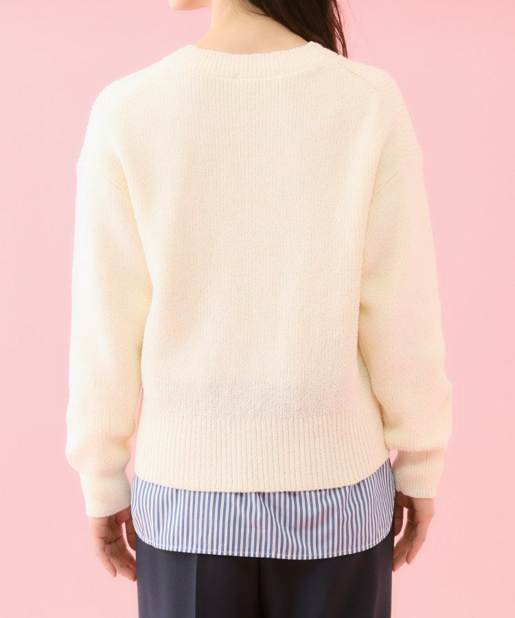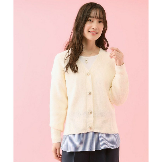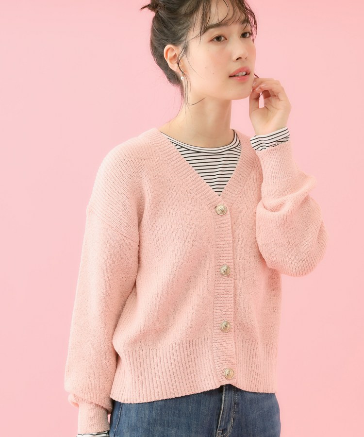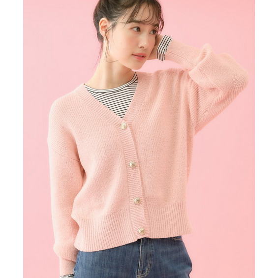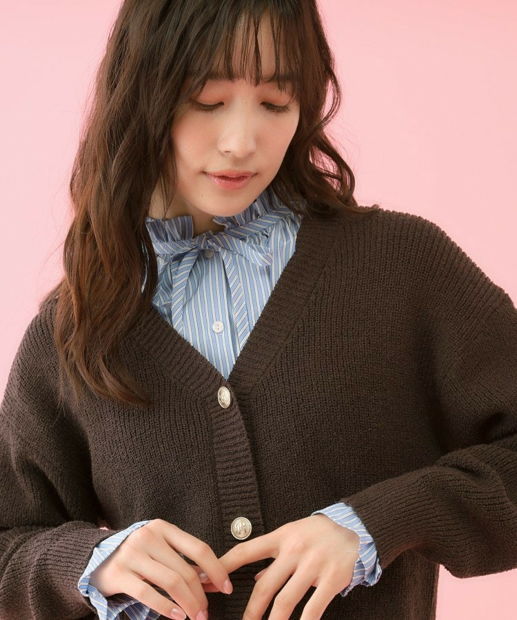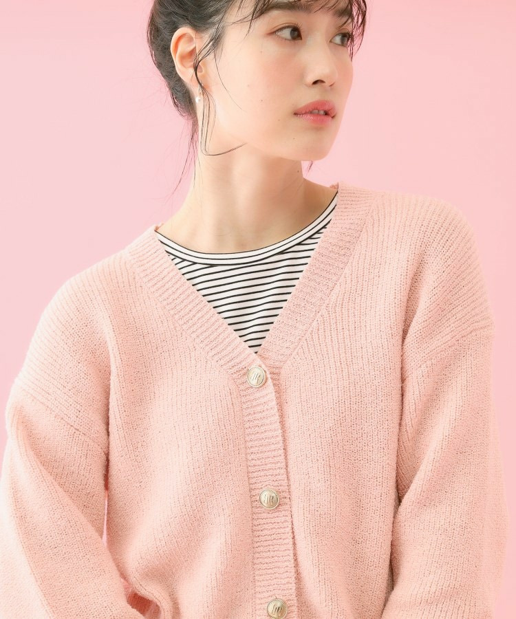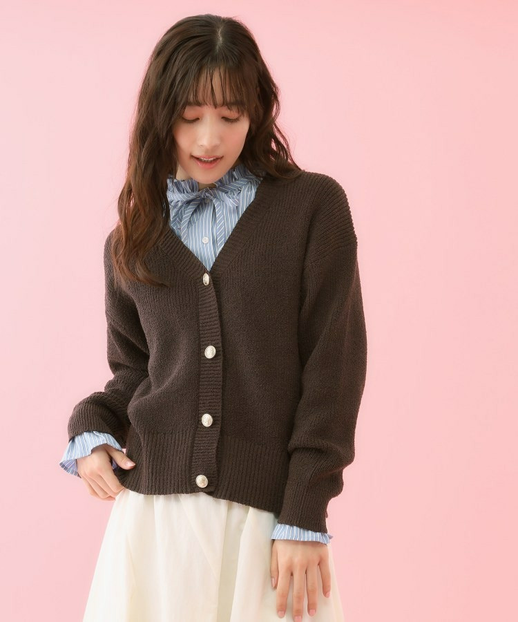 フィリーチョコレートとのコラボレーションで仕上げた、Vネックデザインのブークレニットカーディガンです。