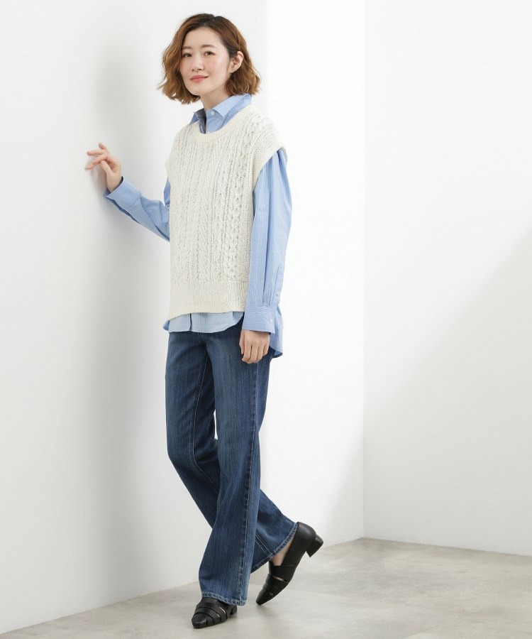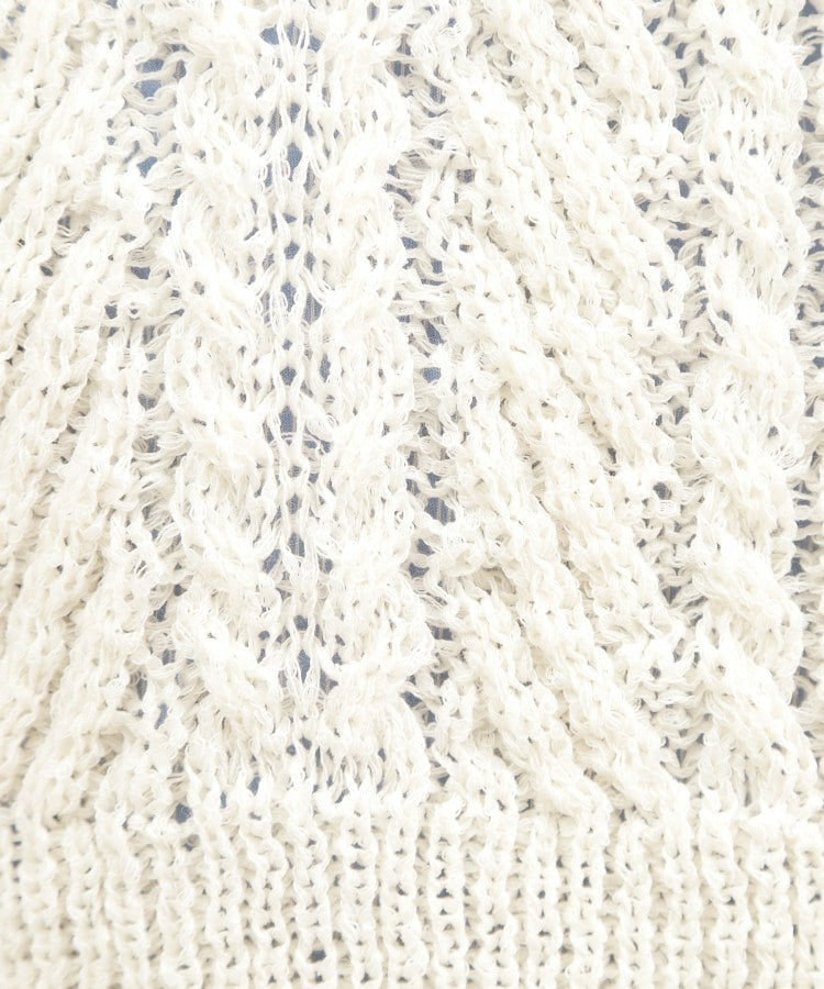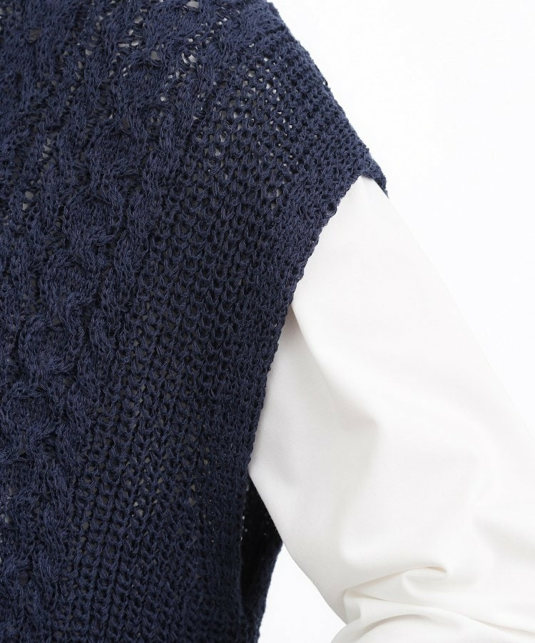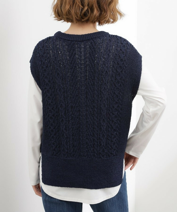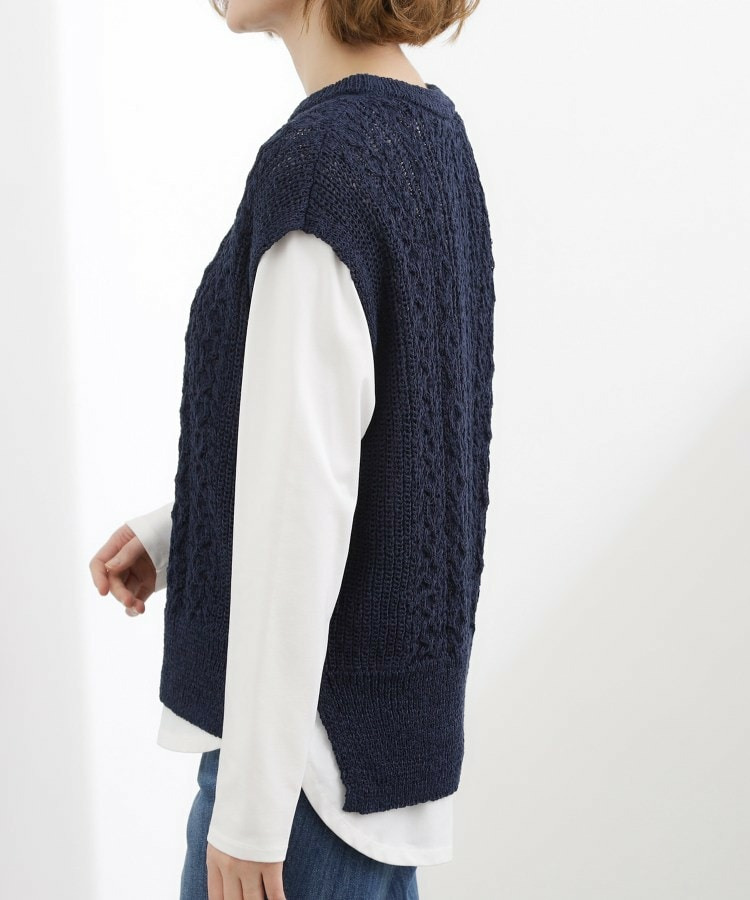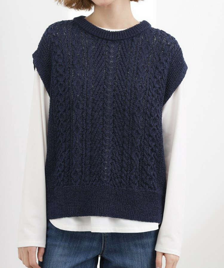 立体感のあるケーブル編みを施しながらも、ベストデザインにすることで春らしく軽快な印象に仕上げています。