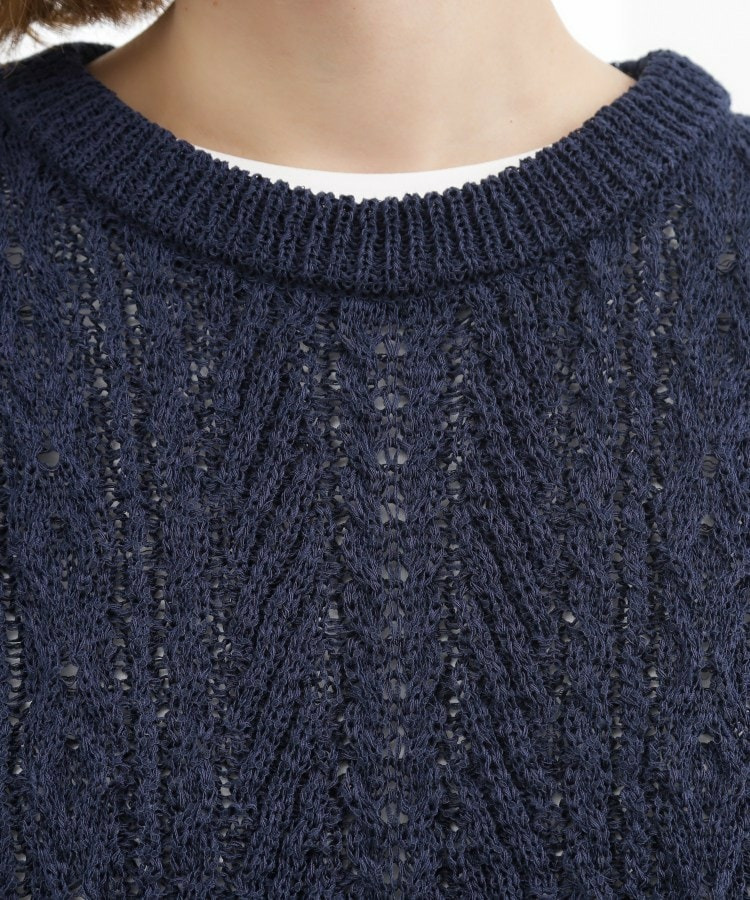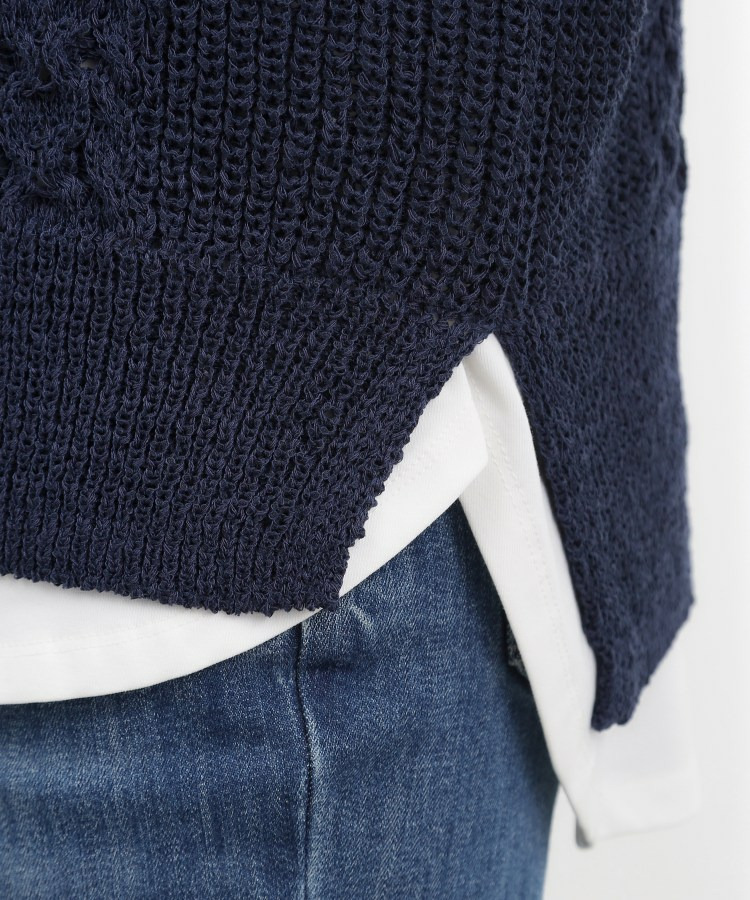 ケーブル編みでも重く見えず、春から初夏まで心地よく着用できる素材感です。