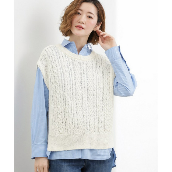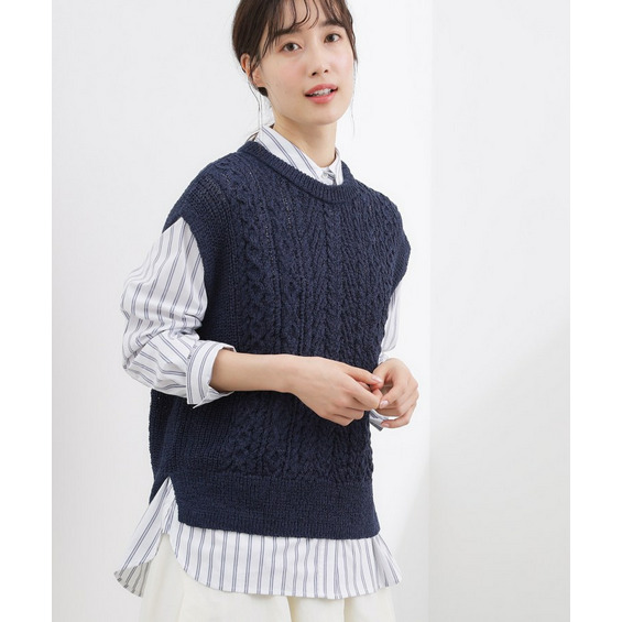 立体感のあるケーブル編みを施しながらも、ベストデザインにすることで春らしく軽快な印象に仕上げています。