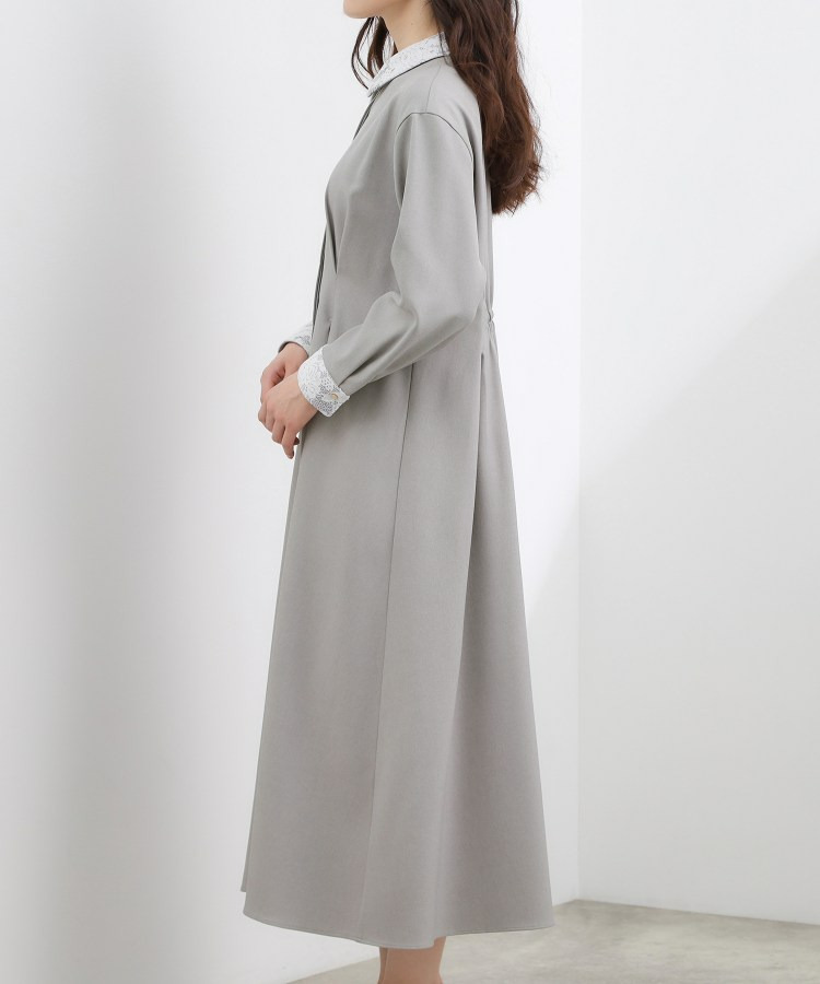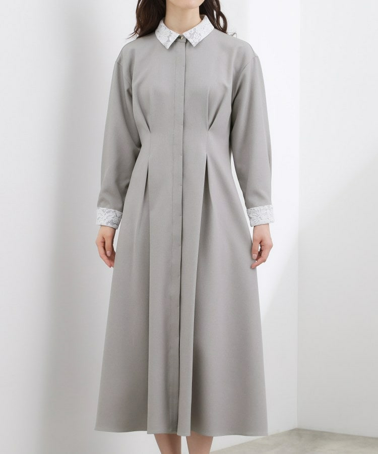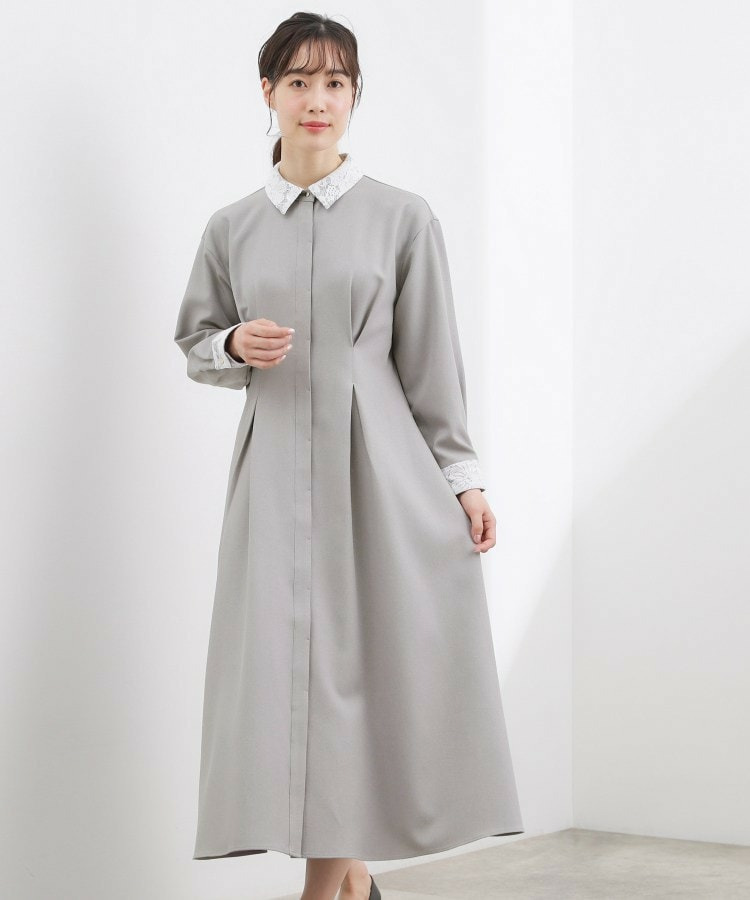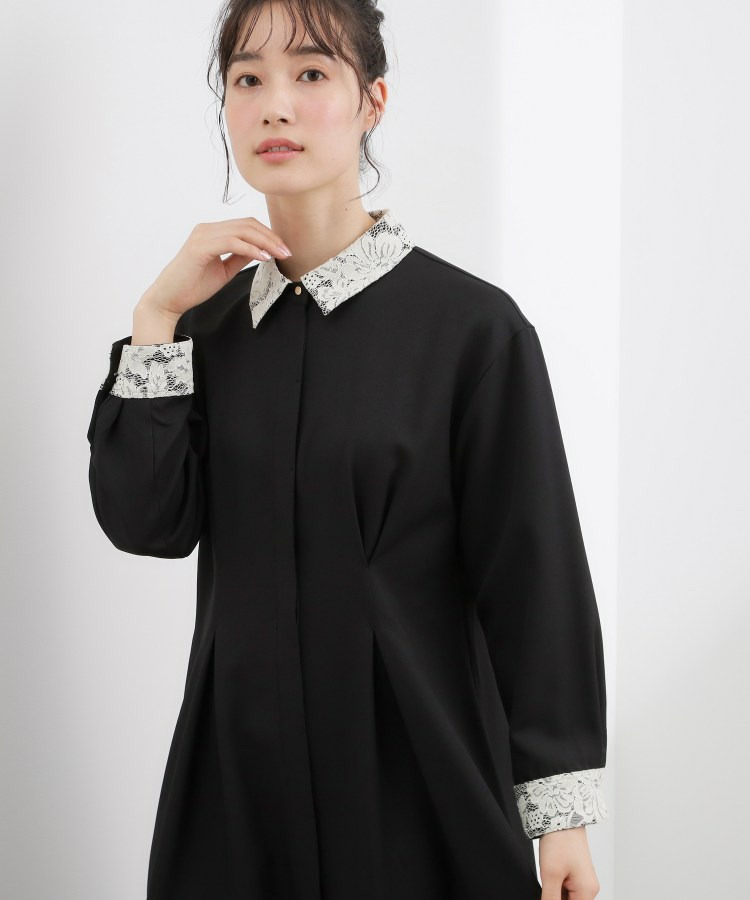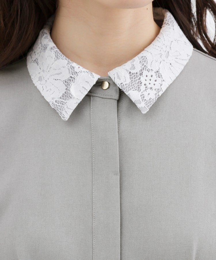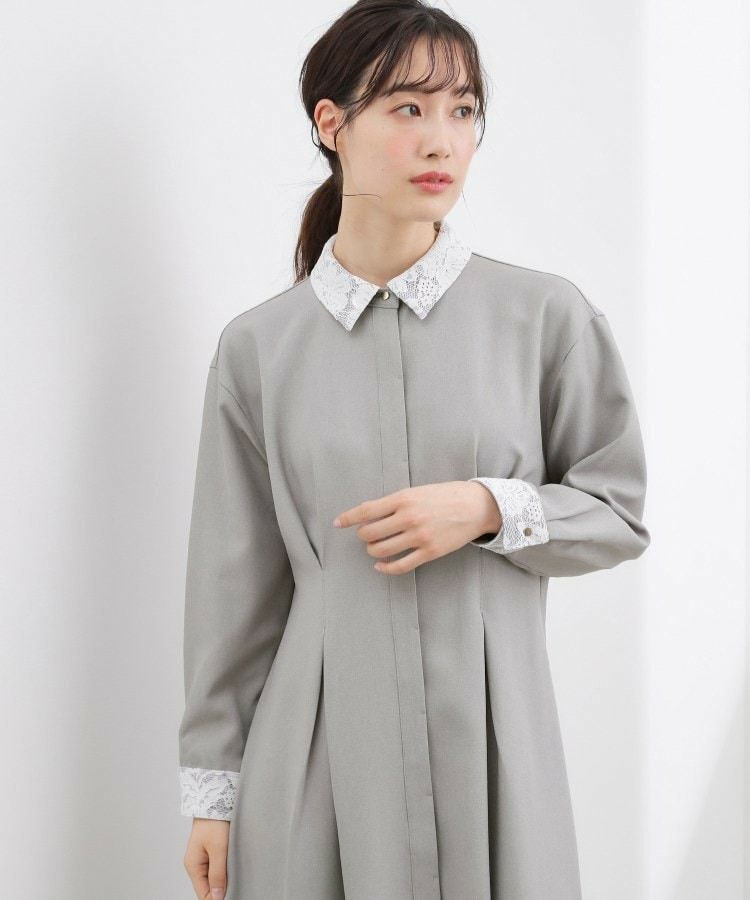 レースを二重にした襟が印象的な、上品な佇まいのシャツワンピースです。