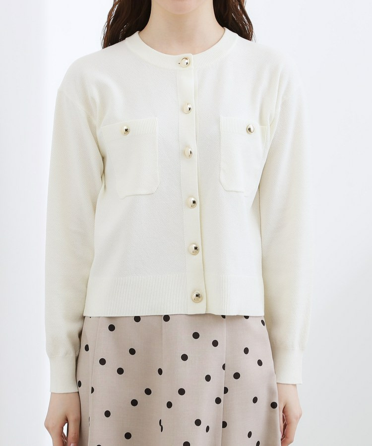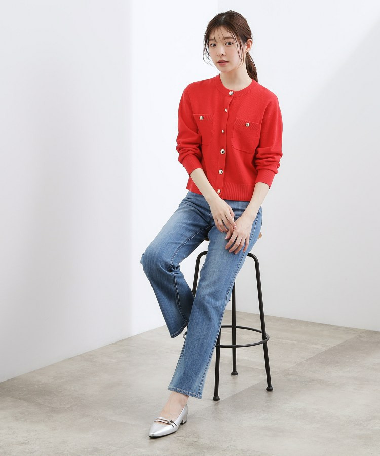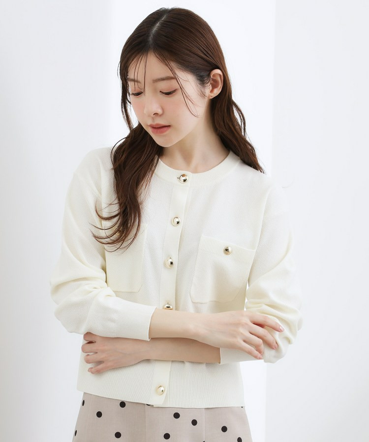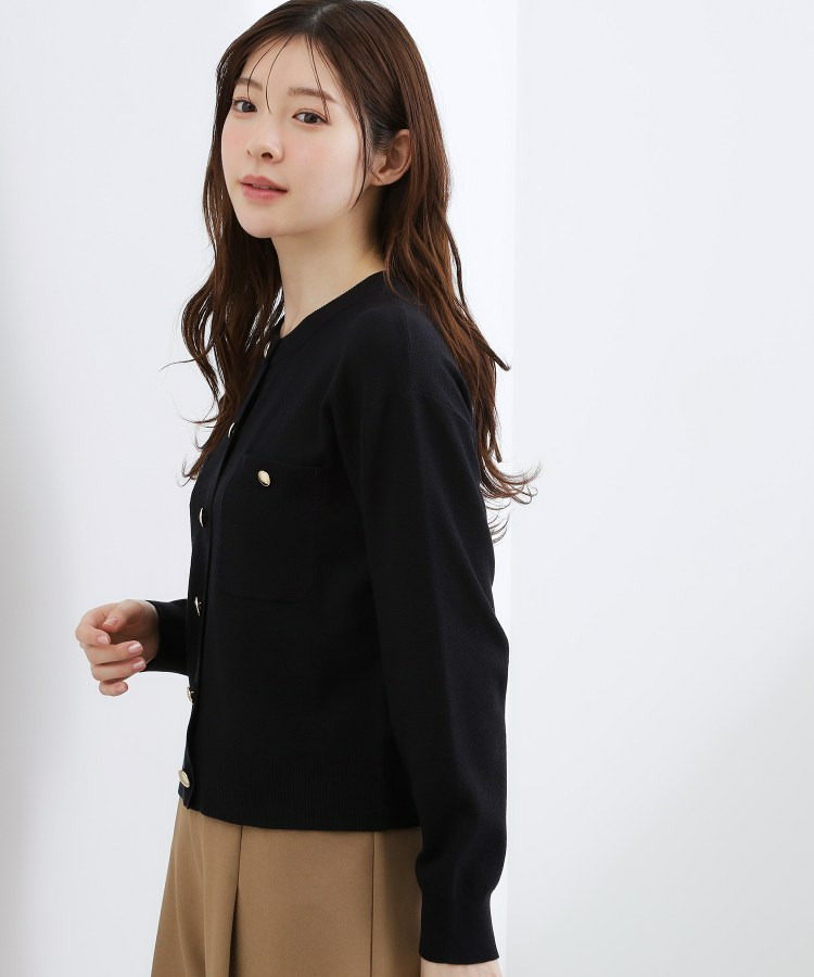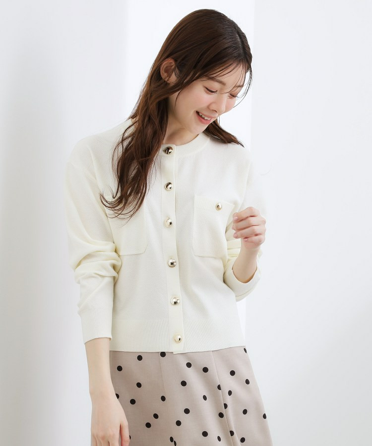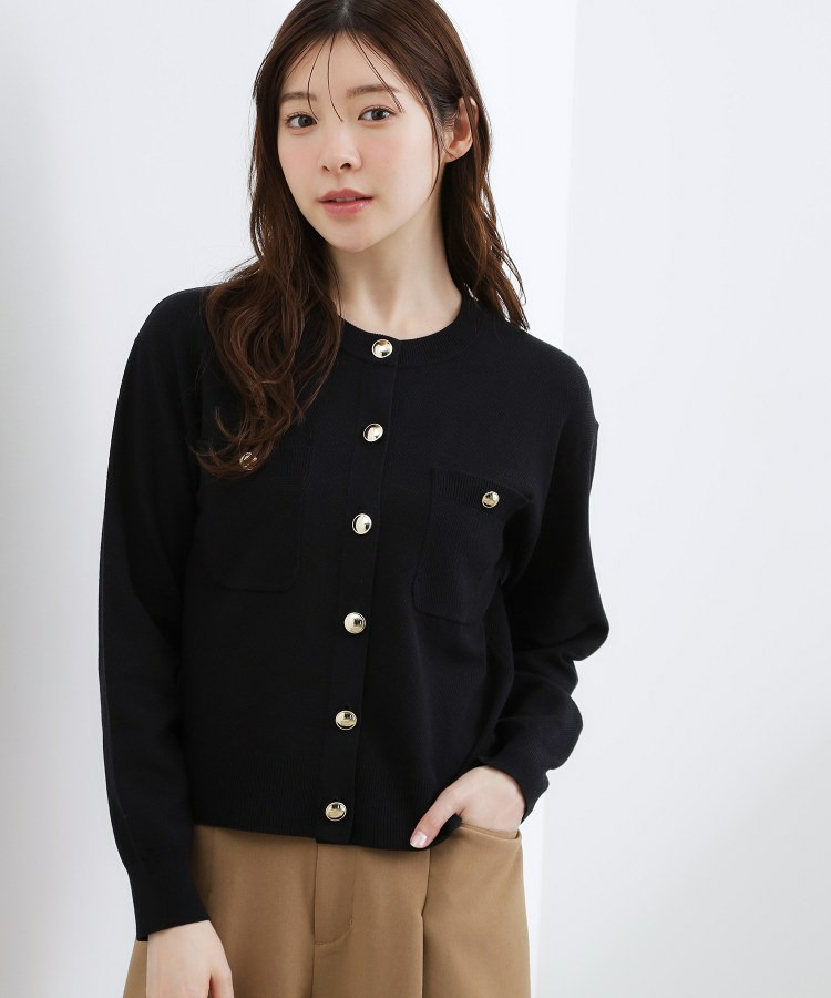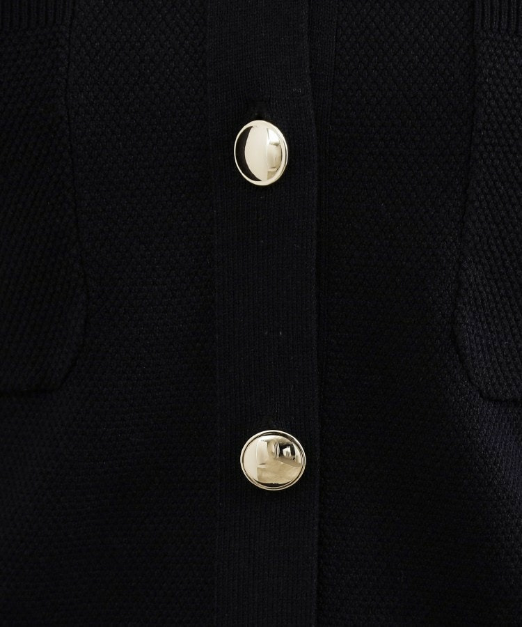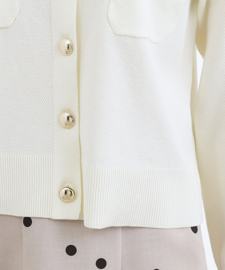 フロントボタンとポケット部分にはメタル調ボタンをあしらい、程よいきちんと感と上品さをプラス。