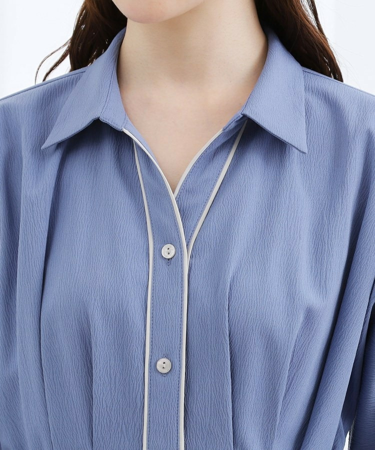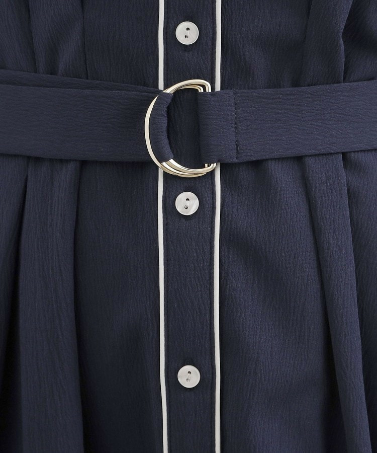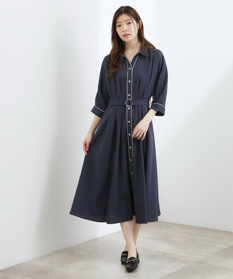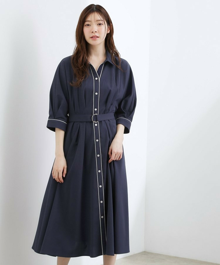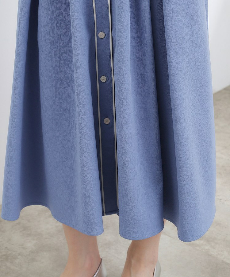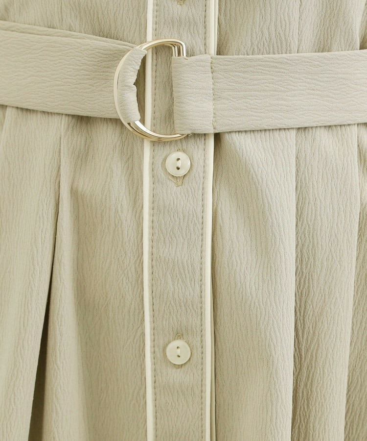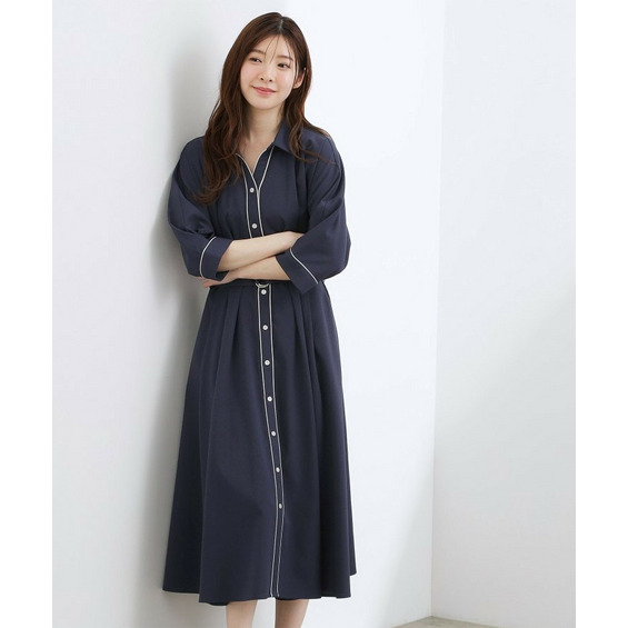 ボタン見せの前開きデザインで、前ウエスト部分にはタックを中縫いすることで、自然にシェイプされた女性らしいシルエットに。