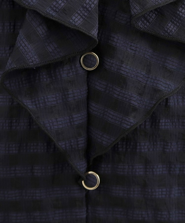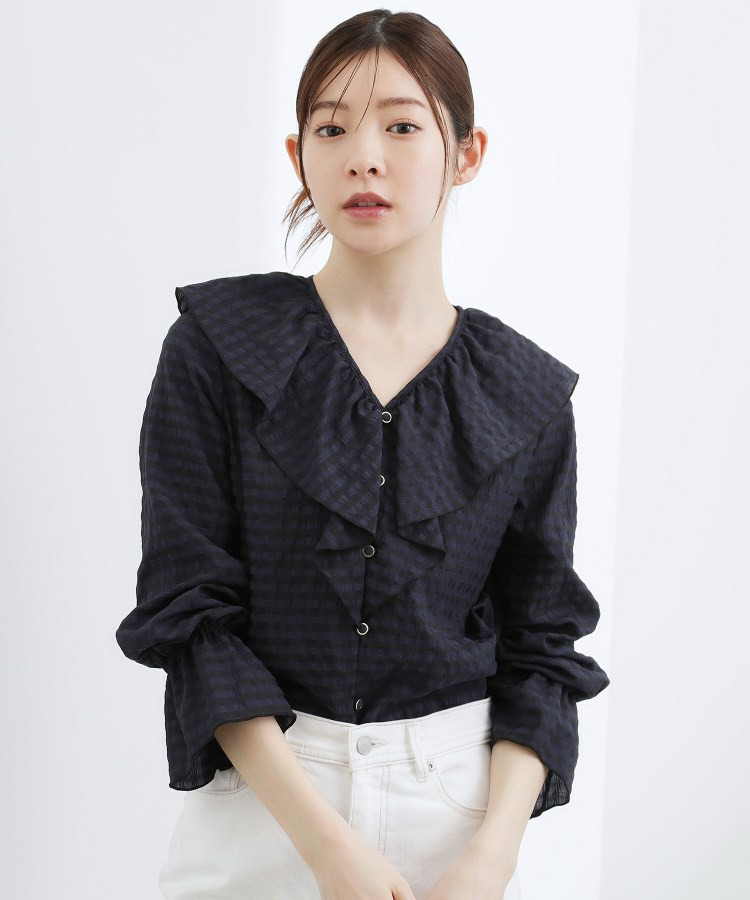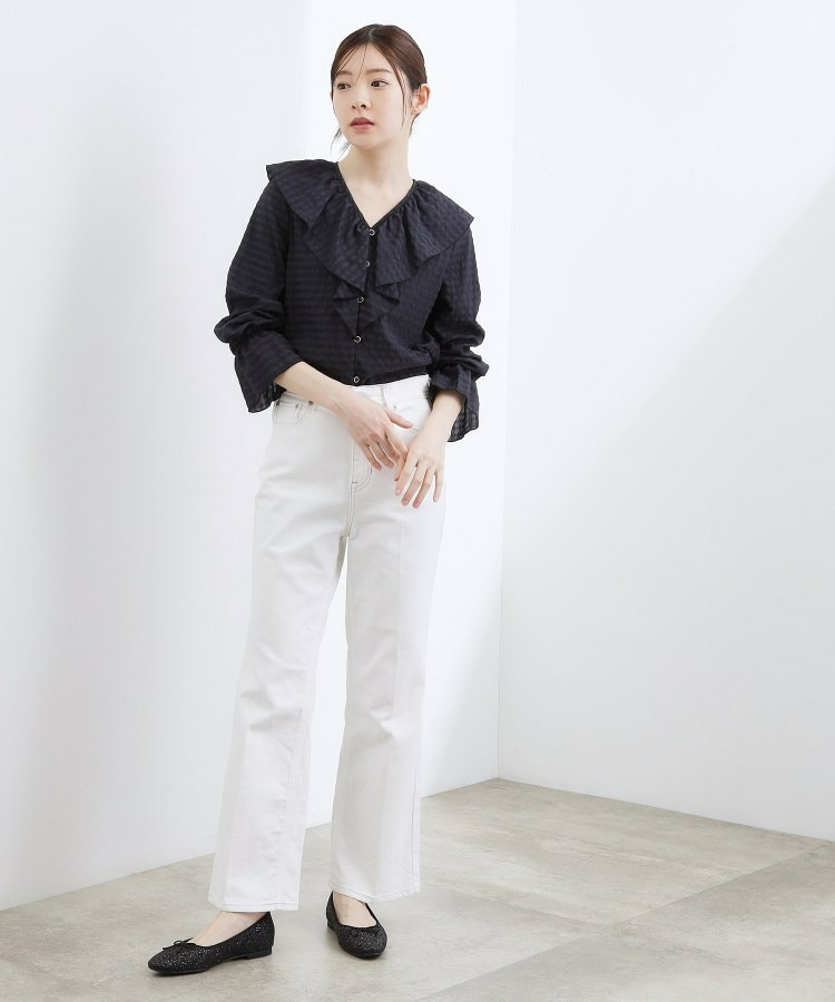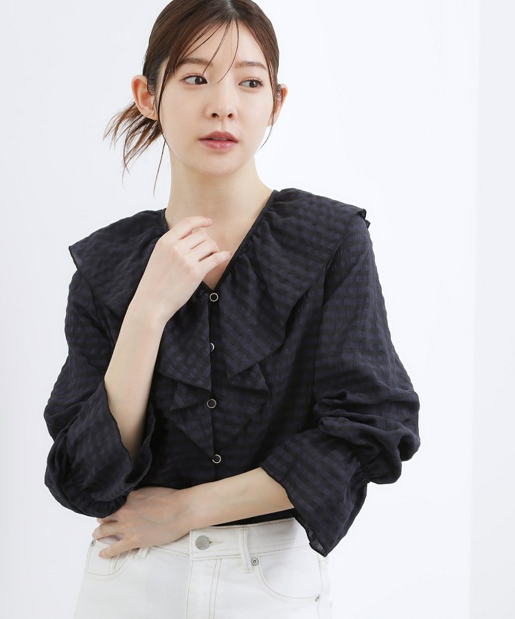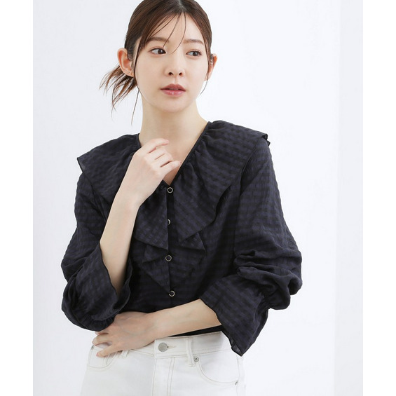 襟元のフリルが顔まわりを華やかに演出し、着こなしにやさしいアクセントを添えます。