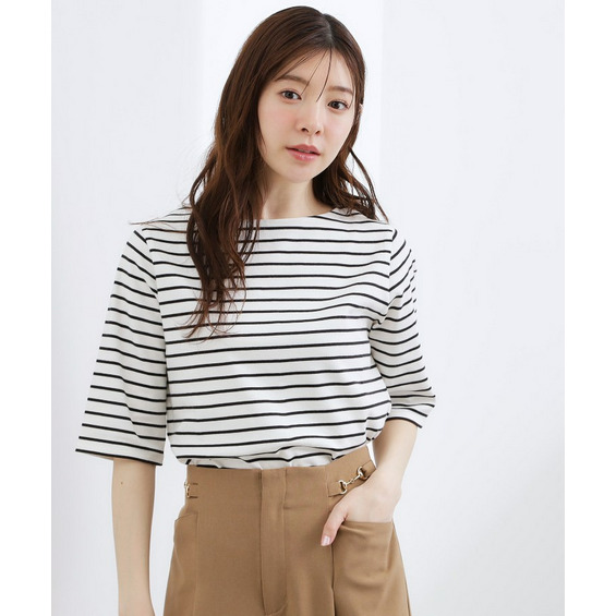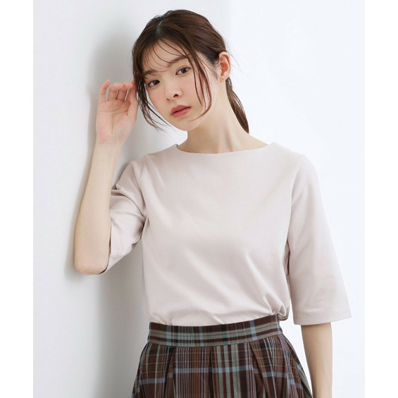 デコルテをきれいに見せてくれるボートネックで、シンプルながらも女性らしいカットソー。