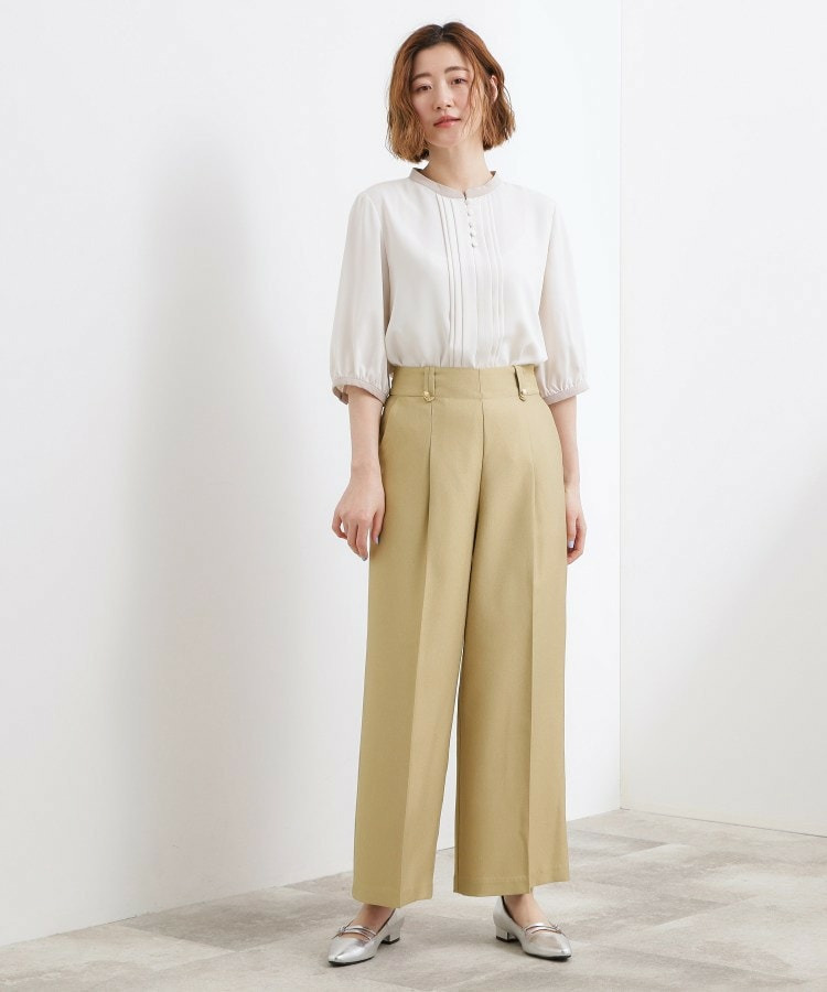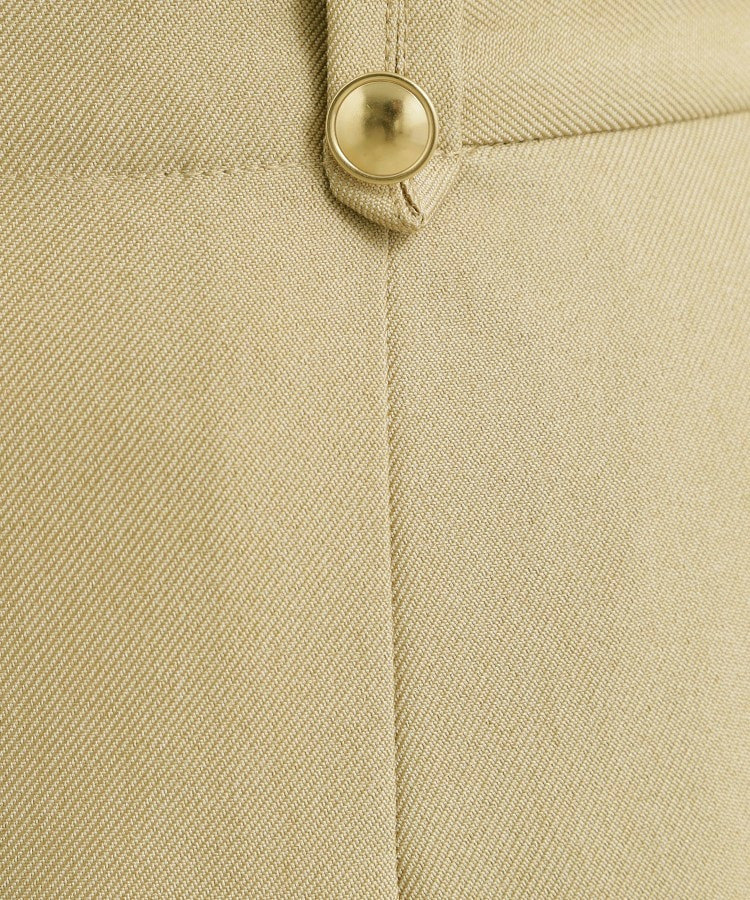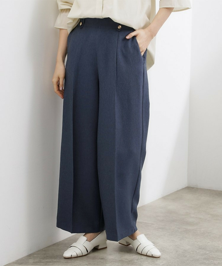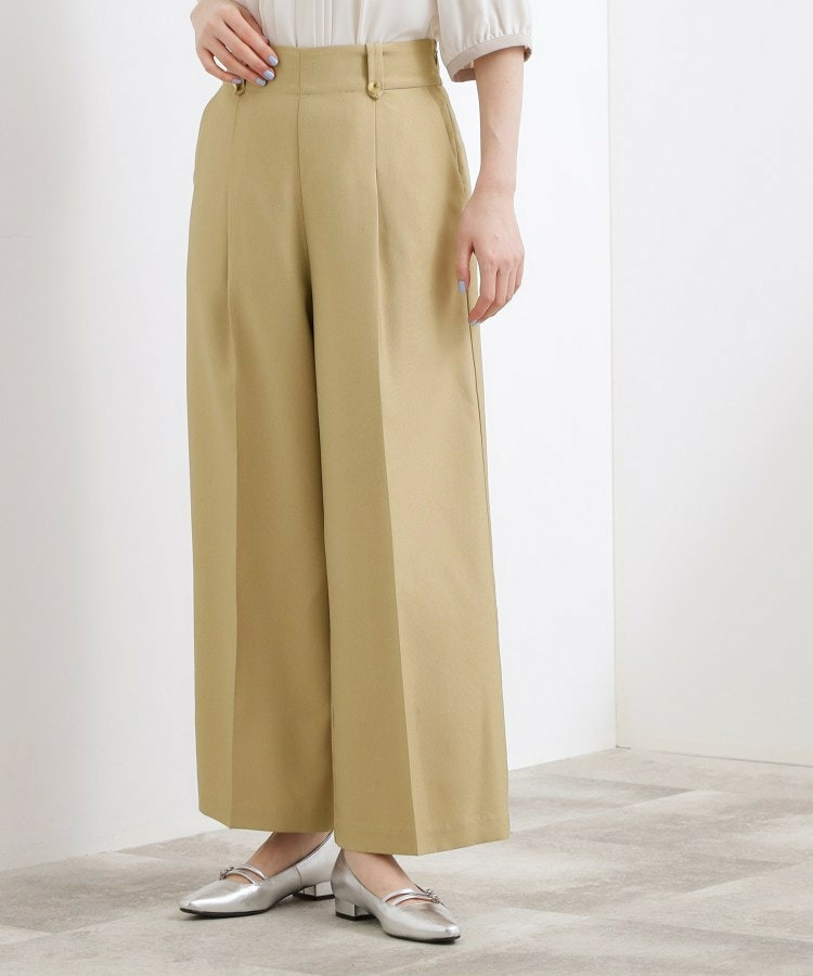 ウエストにはタブベルトデザインを取り入れ、ゴールドボタンをアクセントにプラス。