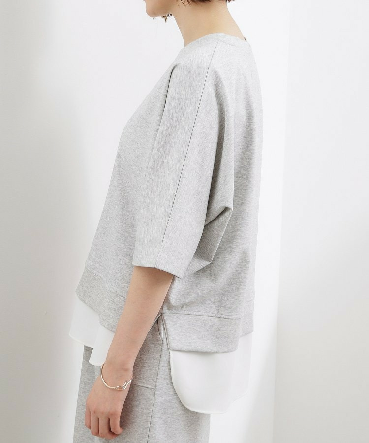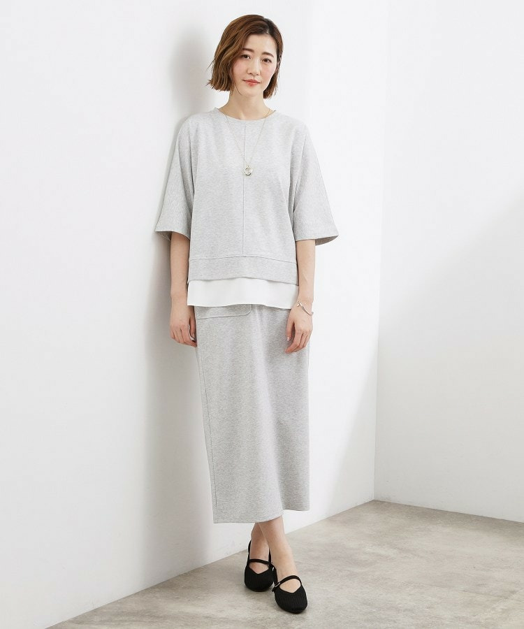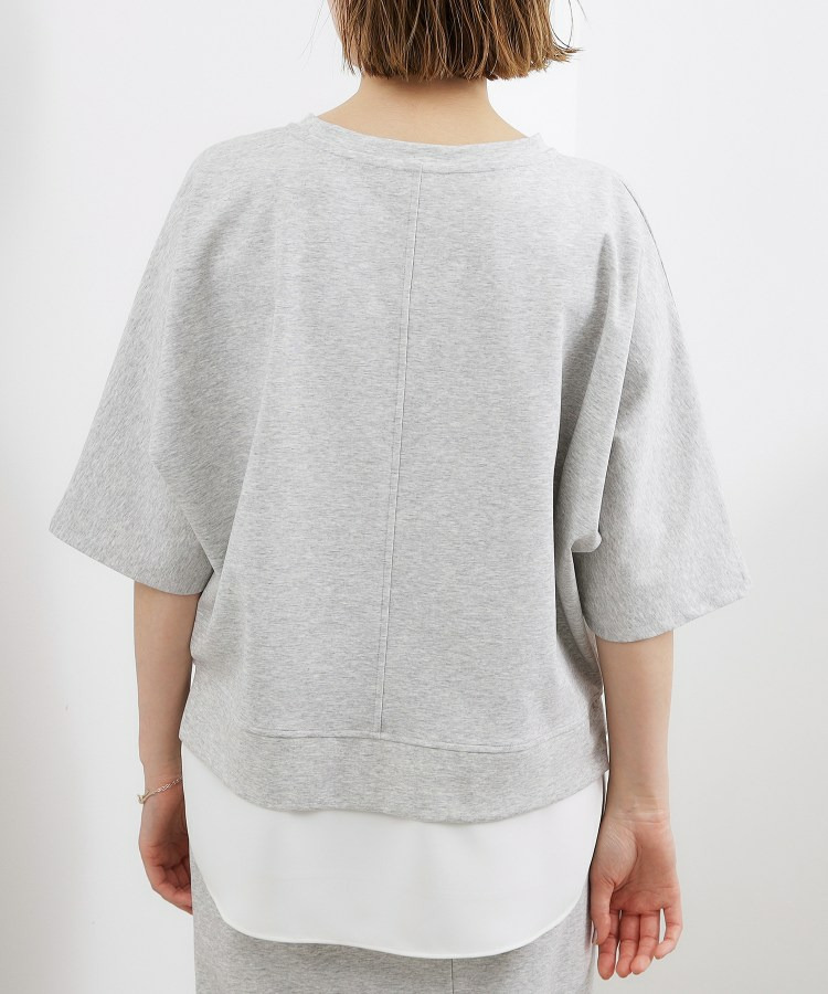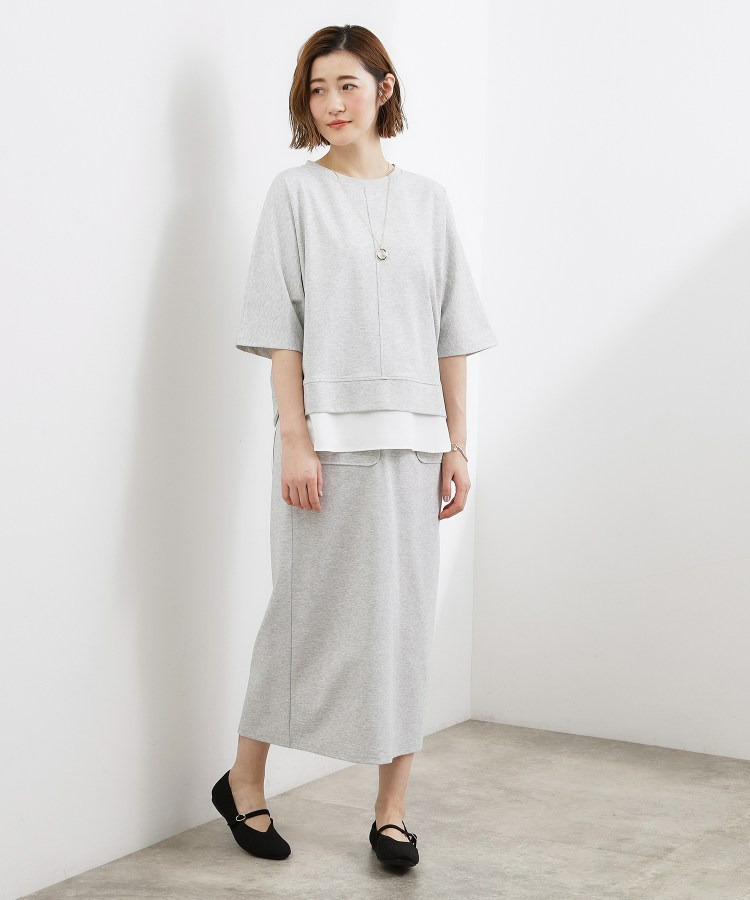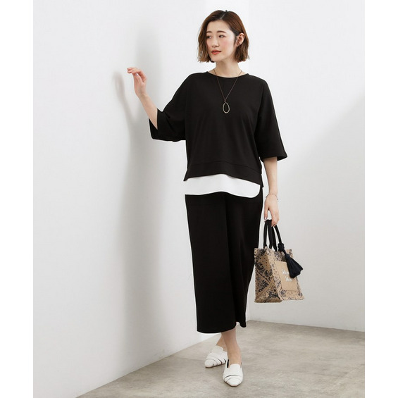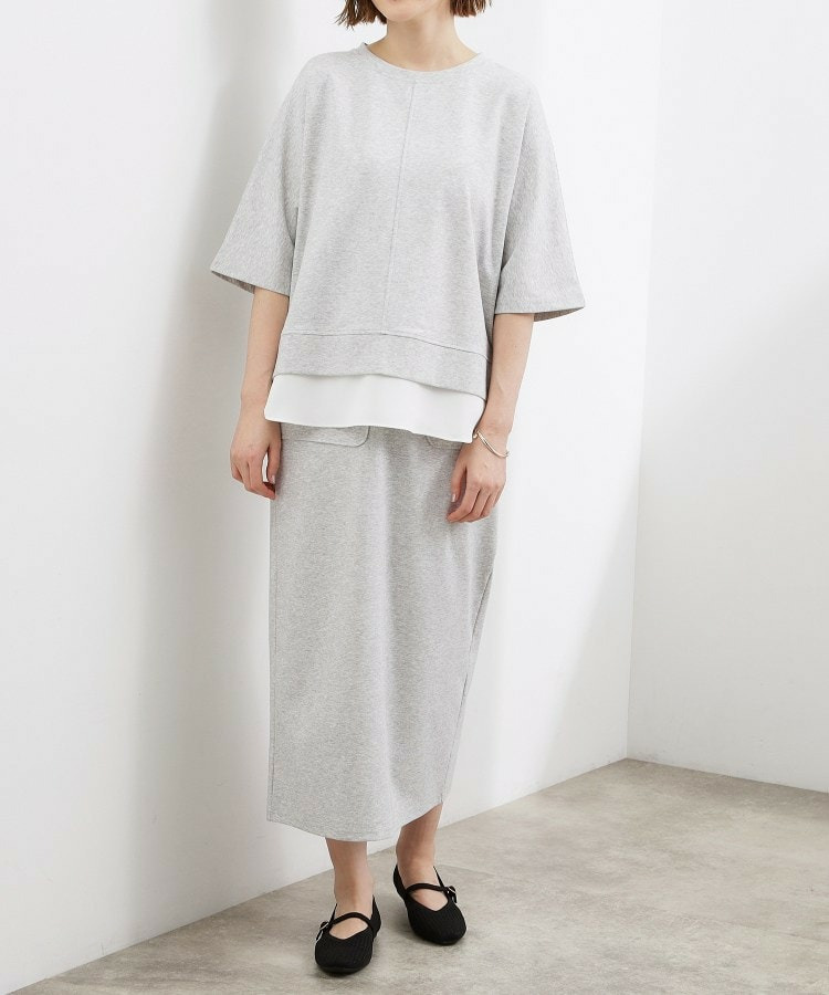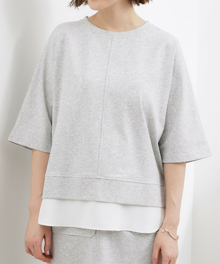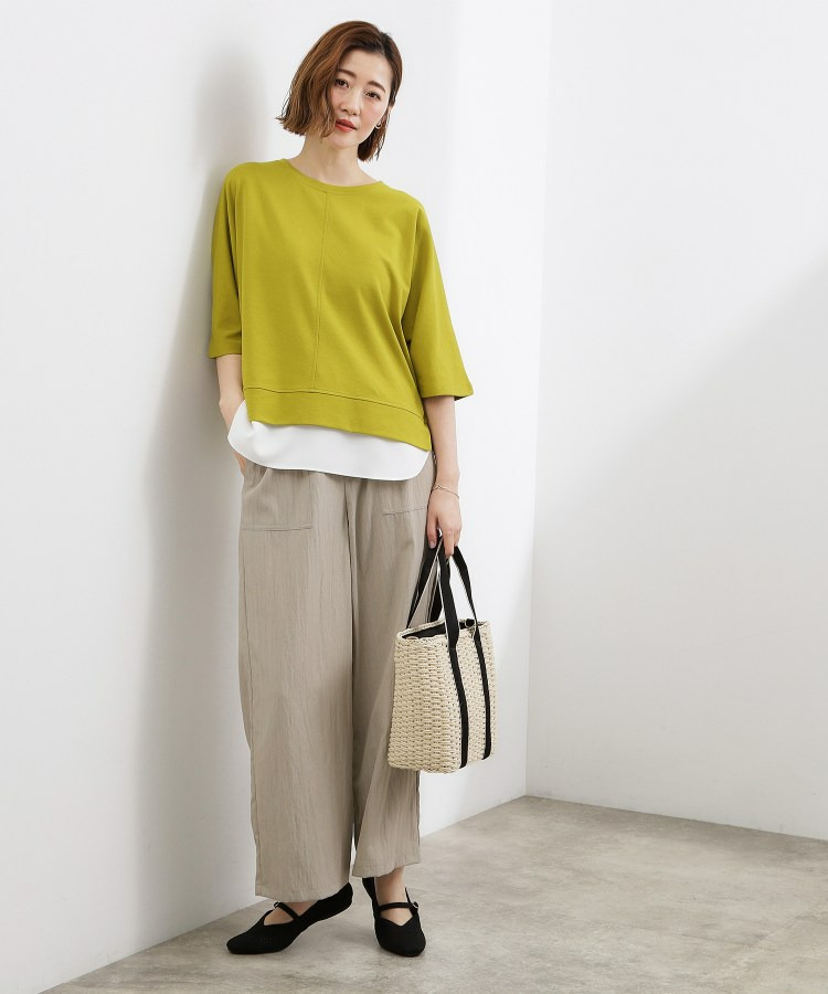 トップスはゆったりとしたドルマンシルエットの5分袖Tシャツに、裾を布帛素材で切り替えたレイヤード見えデザイン。