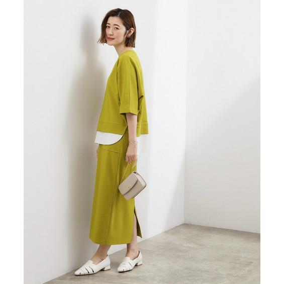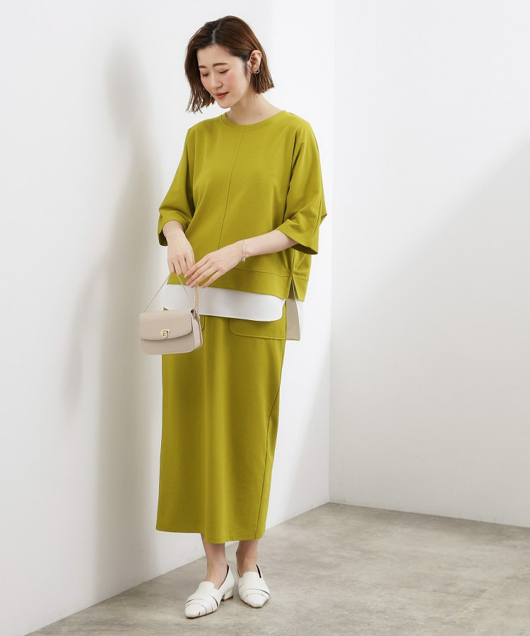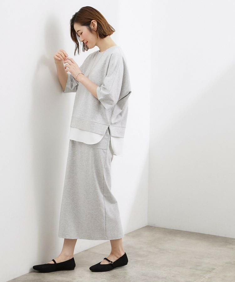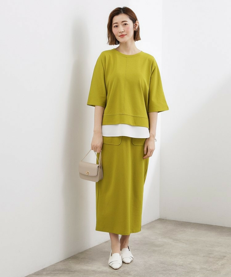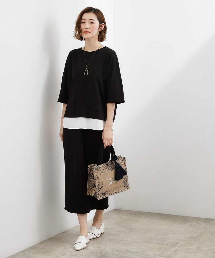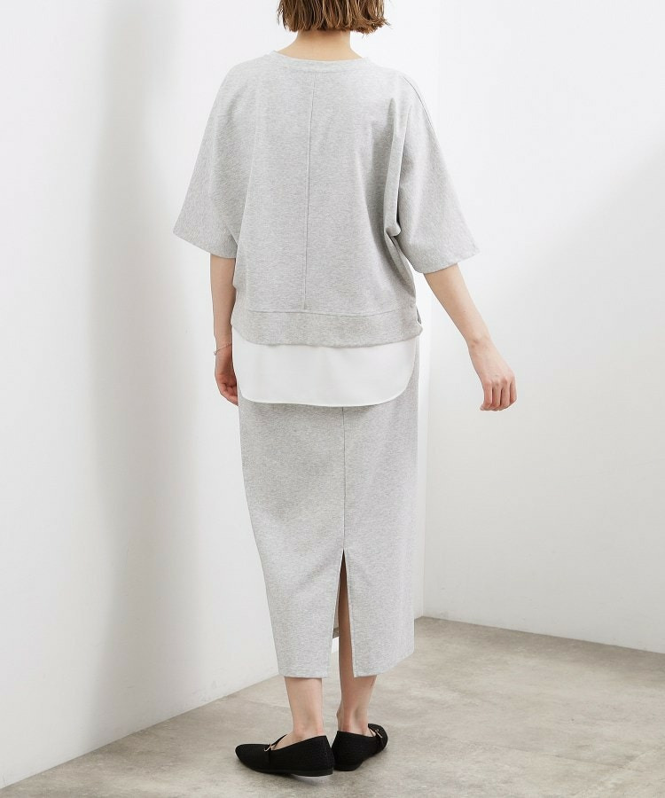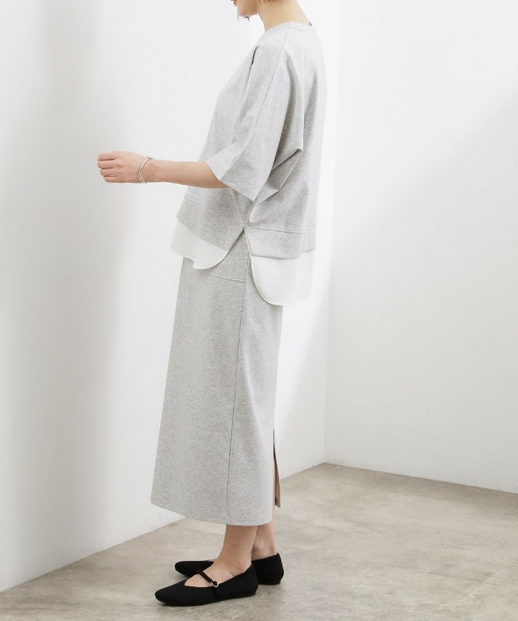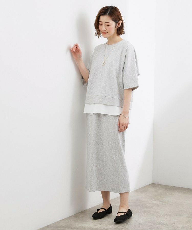 トップスはゆったりとしたドルマンシルエットの5分袖Tシャツに、裾を布帛素材で切り替えたレイヤード見えデザイン。