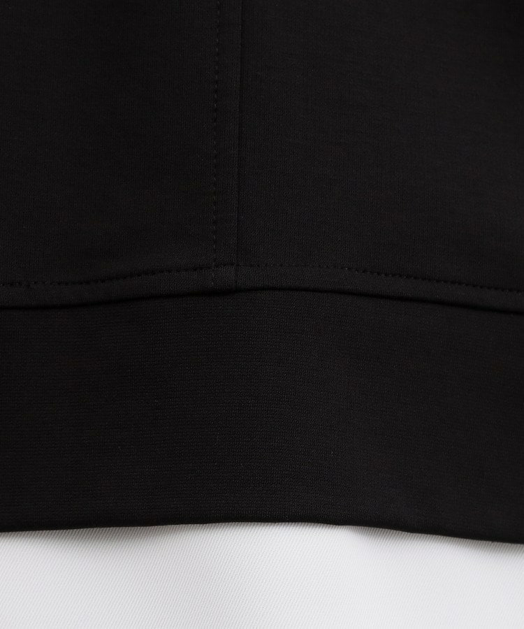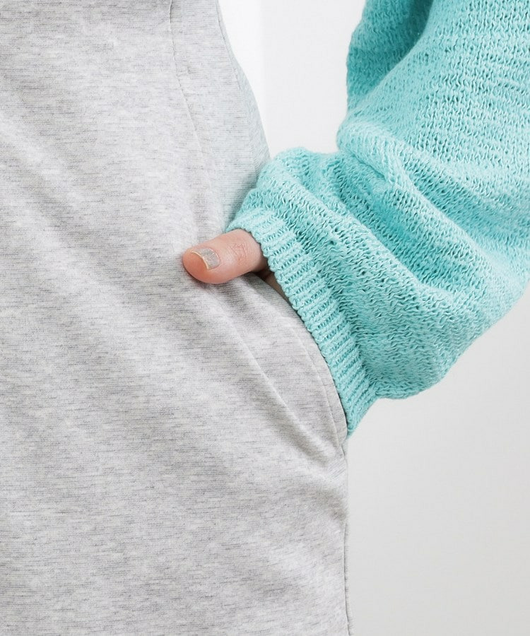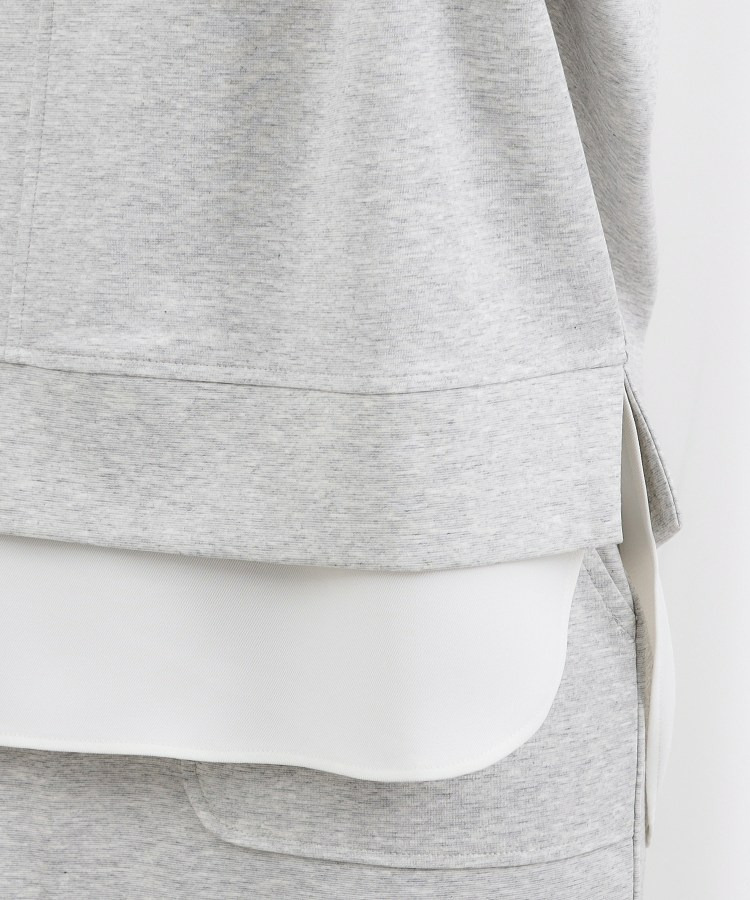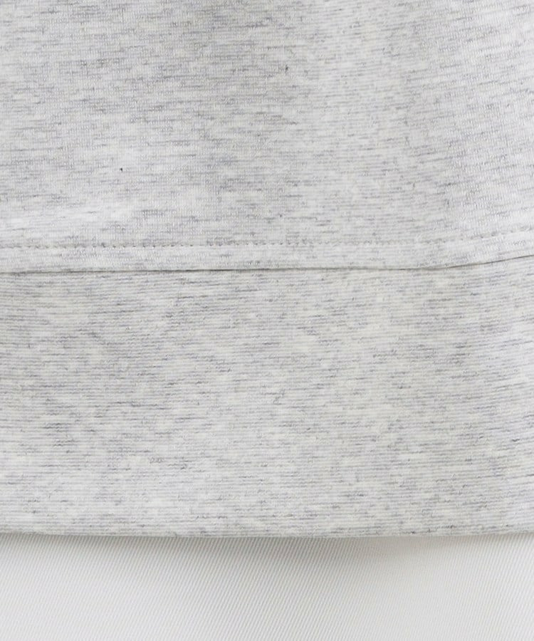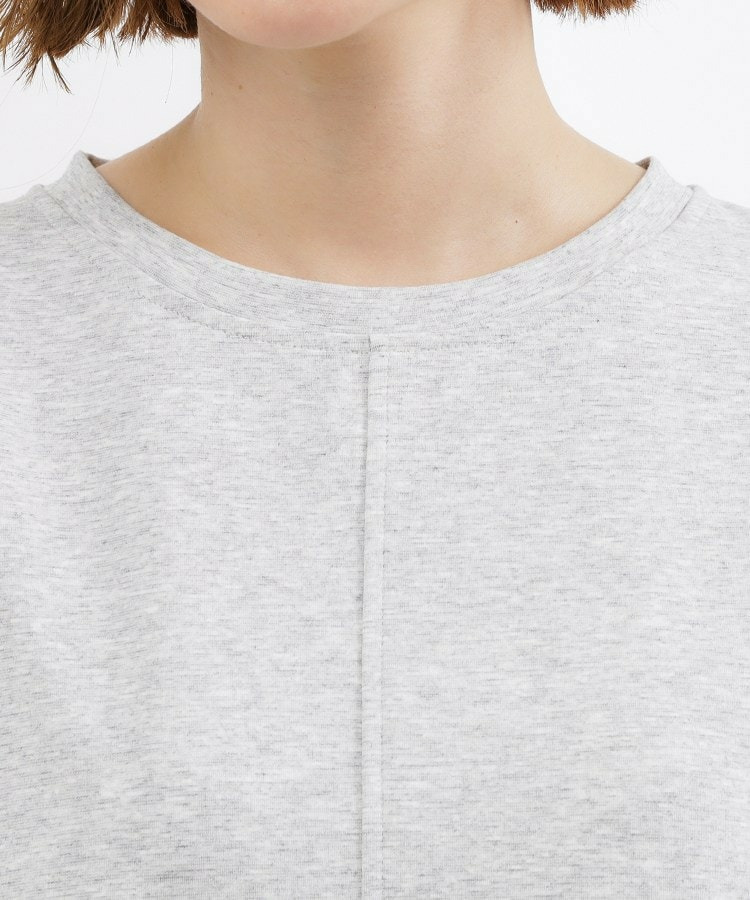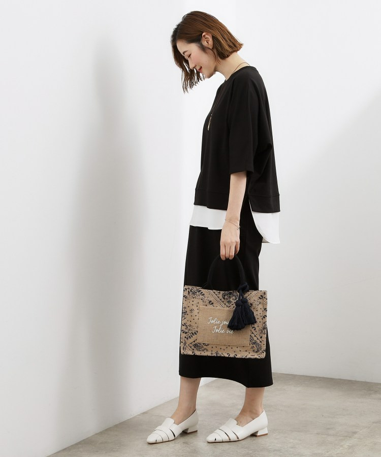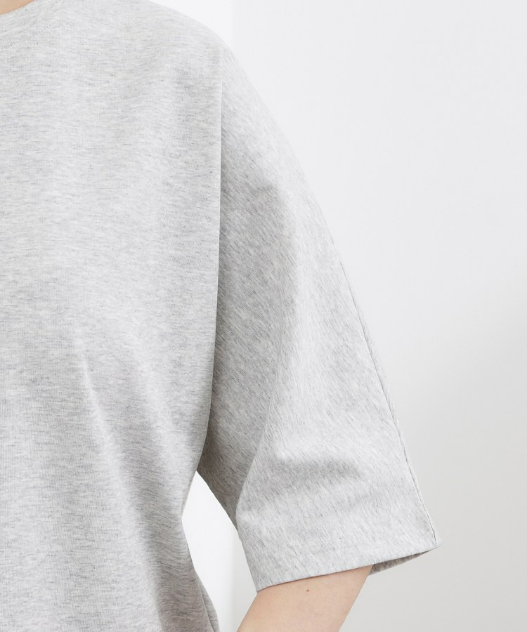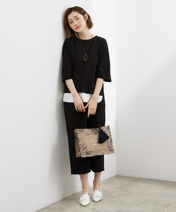 トップスはゆったりとしたドルマンシルエットの5分袖Tシャツに、裾を布帛素材で切り替えたレイヤード見えデザイン。