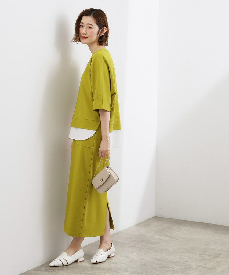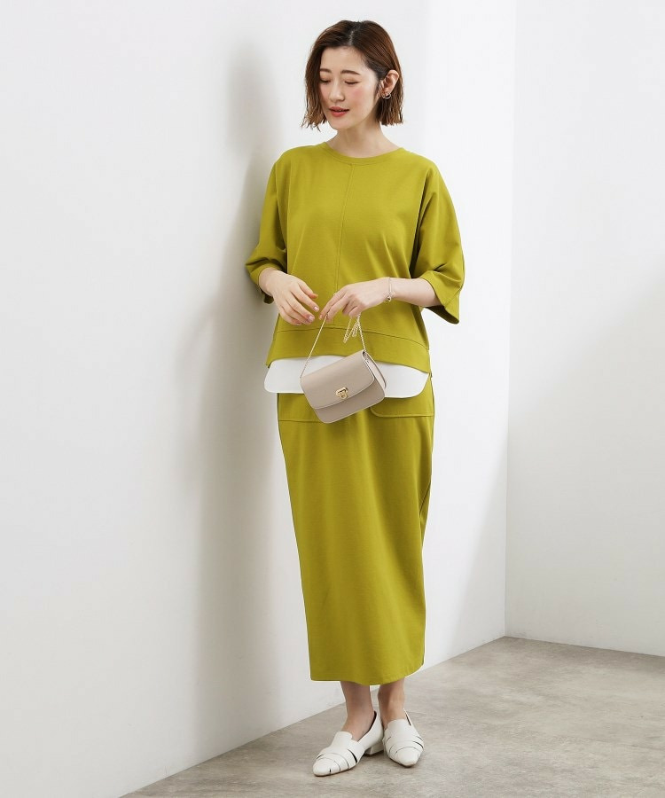 身頃続きのドルマンシルエットトップスと、すっきりしたナロースカートの上下セットで、トレンド感のある着こなしが簡単に完成します。