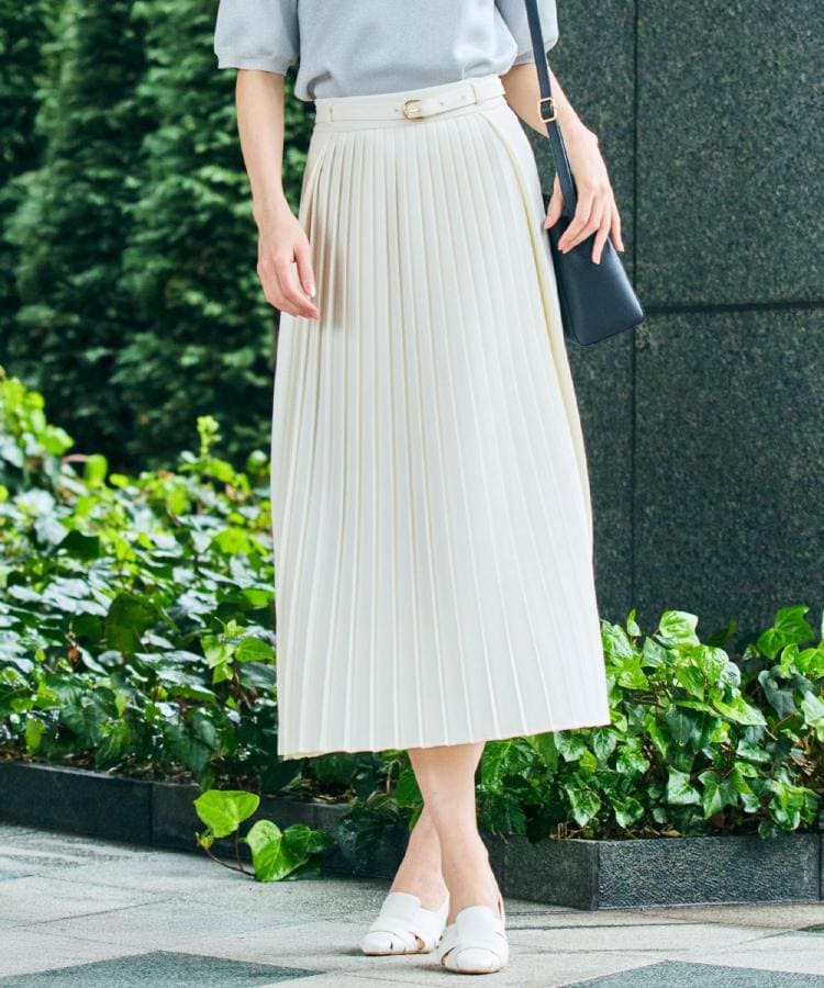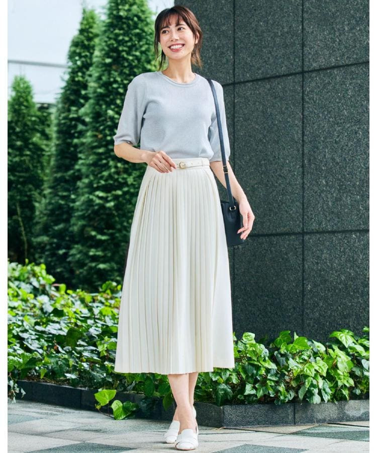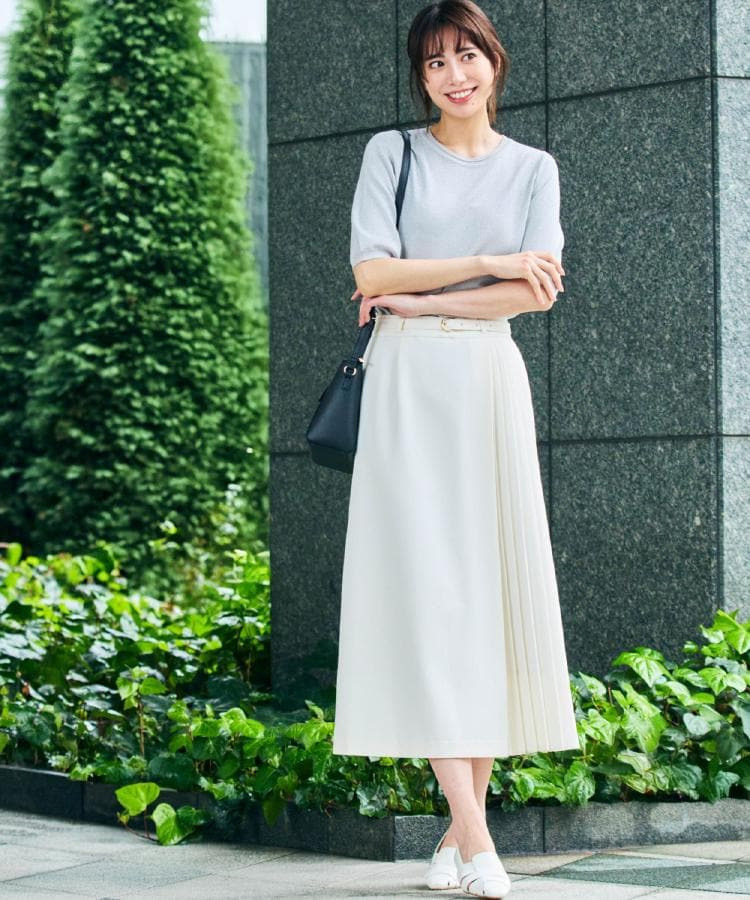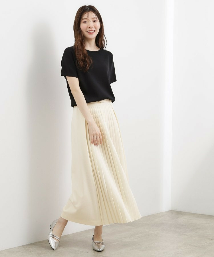 コンパクトなトップスやブラウスを合わせて、プリーツデザインを主役にした着こなしがおすすめ。