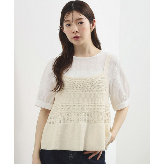 様々な透かし編みテクニックを取り入れたニットキャミとブラウスのSETアイテム。