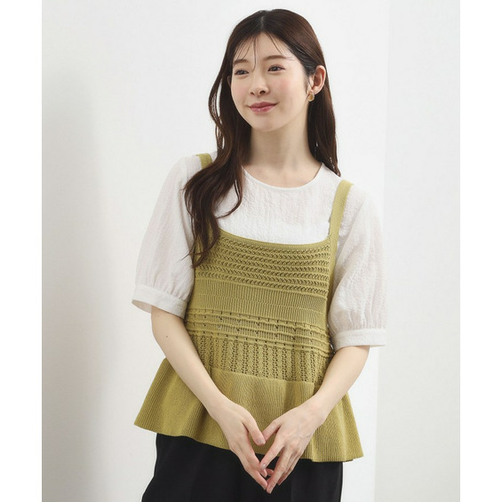 ニットキャミは柄を変えた透かし編みがポイントで、裾は自然に広がるペプラムシルエット。