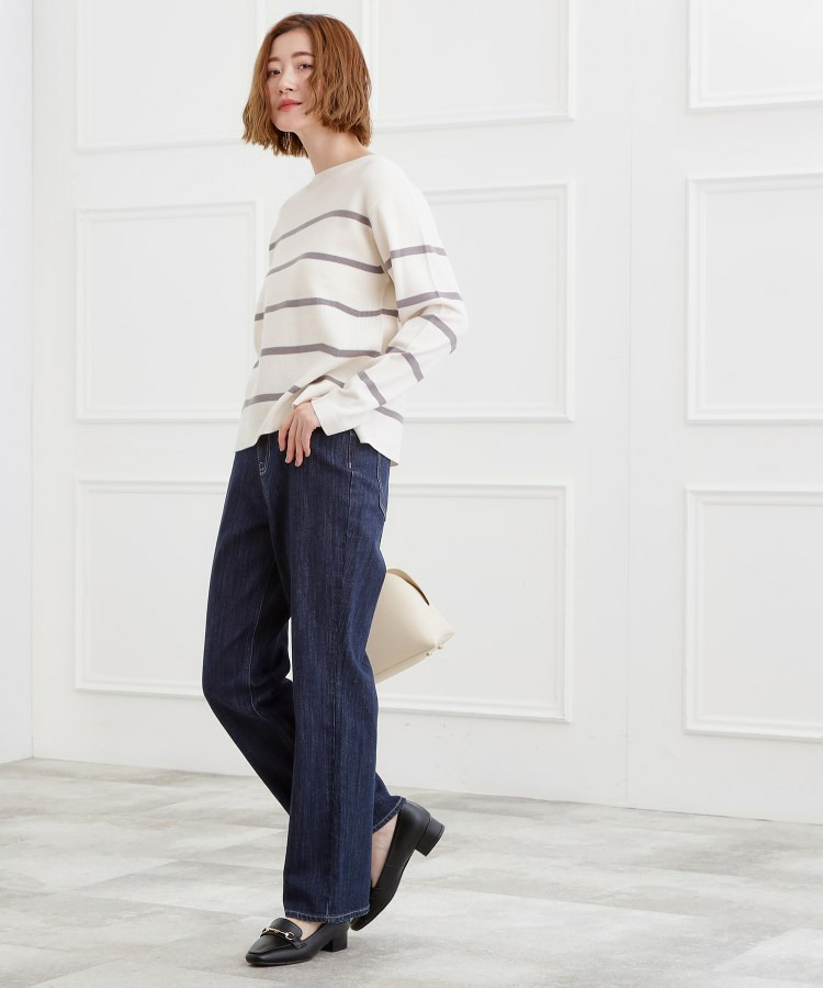 深めの股上が腰まわりを安定させつつ脚をまっすぐ長く見せ、ほどよいゆとりがあることで窮屈感のない快適な穿き心地に。