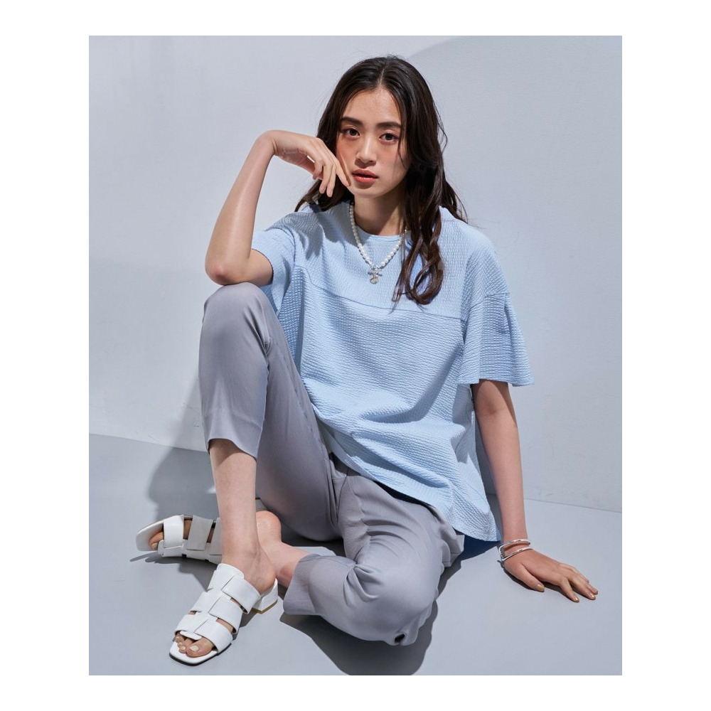 凹凸感あるジャージ素材が着用感も涼しいフレアデザイントップスです。