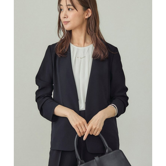 すっきりと決まるノーカラーでナローシルエットの新鮮なデザインです。
